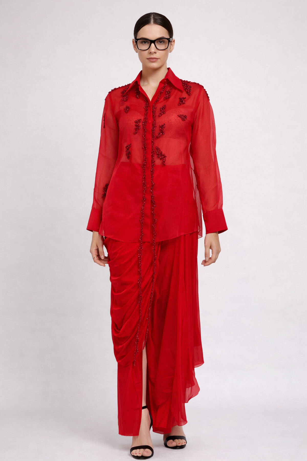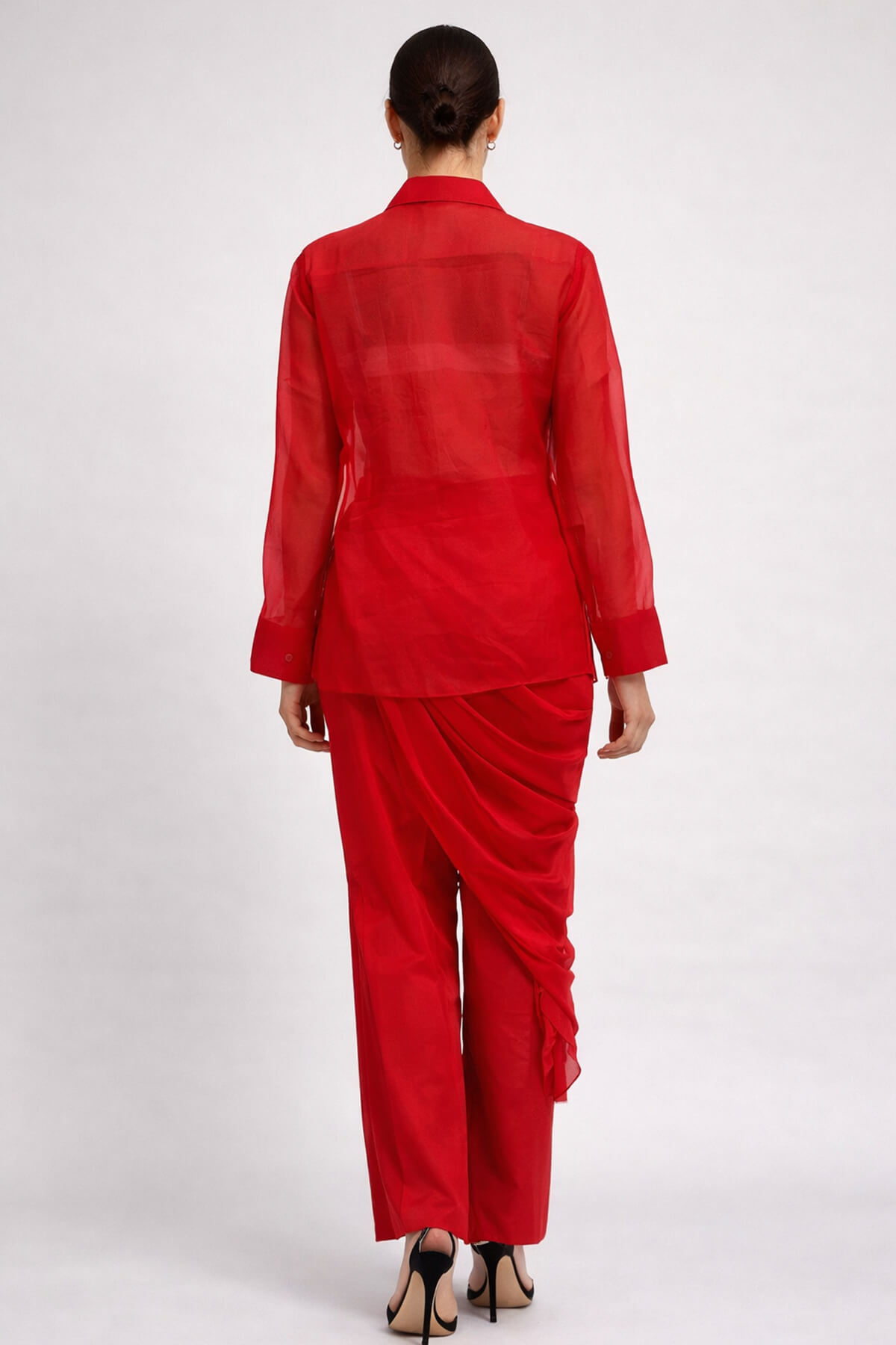 "Organza shirt with handcrafted bow detail, silk pants with drape. Most of these images are AI generated, so there can be a slight difference. "
