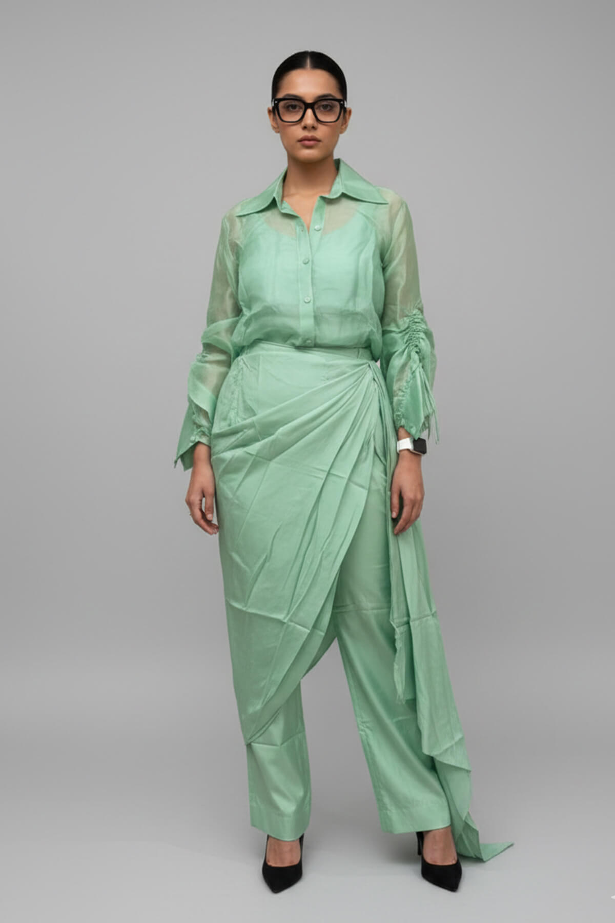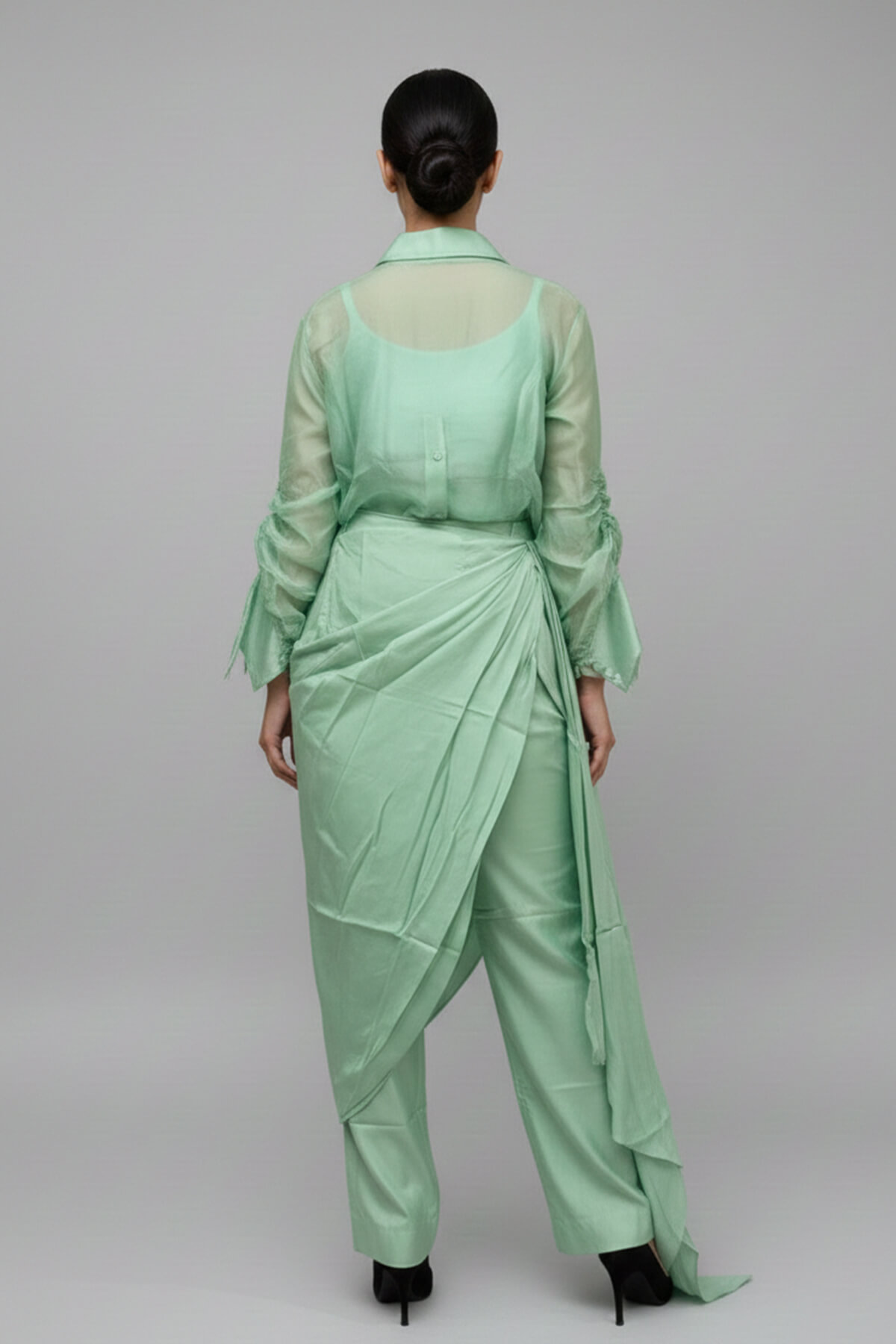 "An organza shirt in pastel green color teamed up with a slip inside and silk drape pants. Most of these images are AI generated, so there can be a slight difference. "