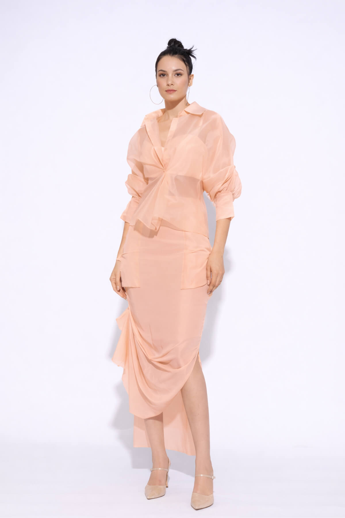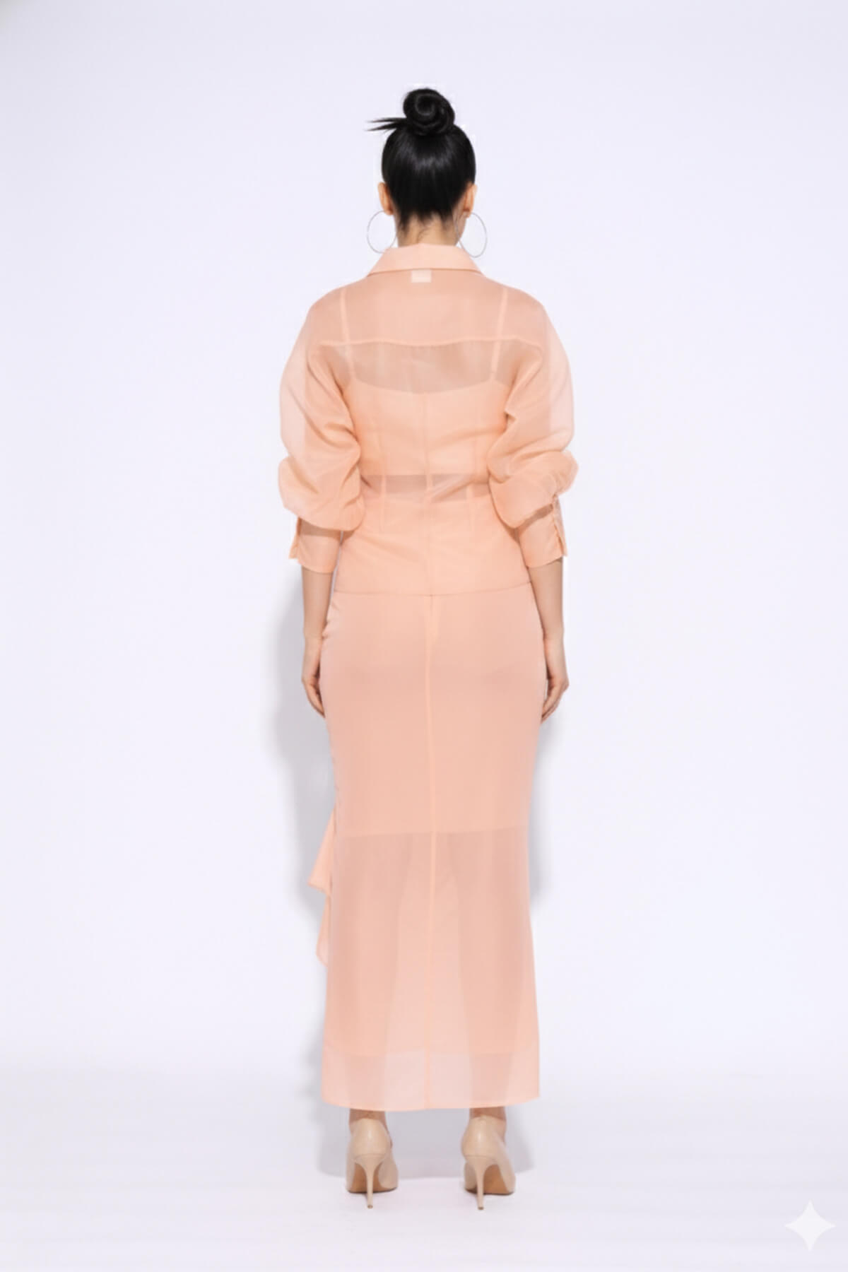 A 3 piece ensemble including a silk bustier, silk skirt & emb. Organza jacket. Most of these images are AI generated, so there can be a slight difference.