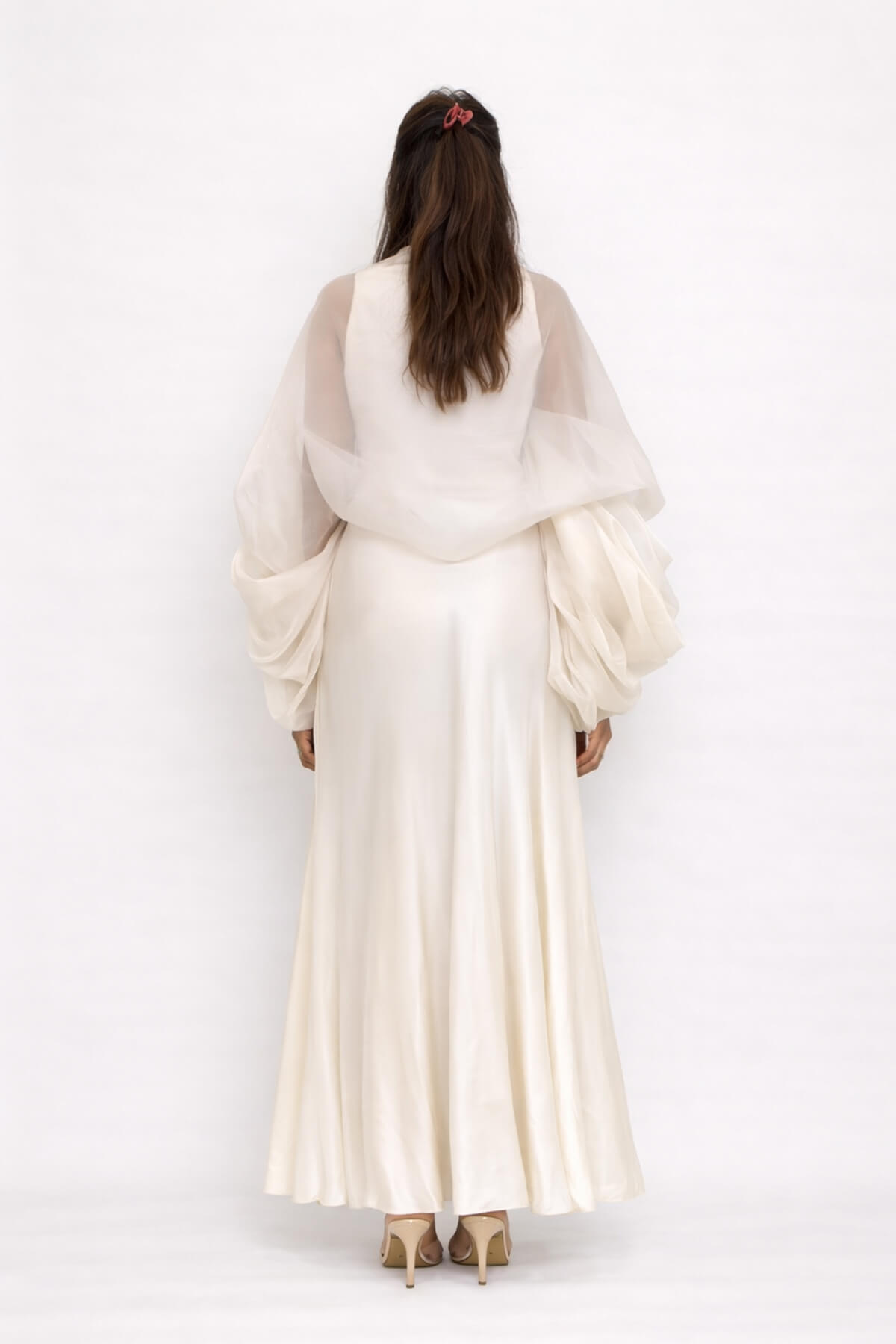 A sleeveless cowl silk dress teamed with volumnious sleeves organza jacket. Most of these images are AI generated, so there can be a slight difference.