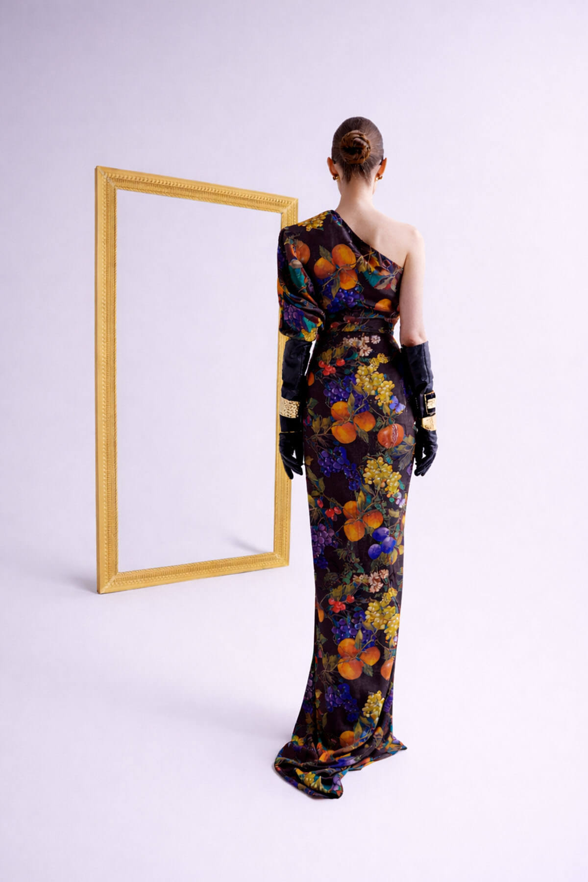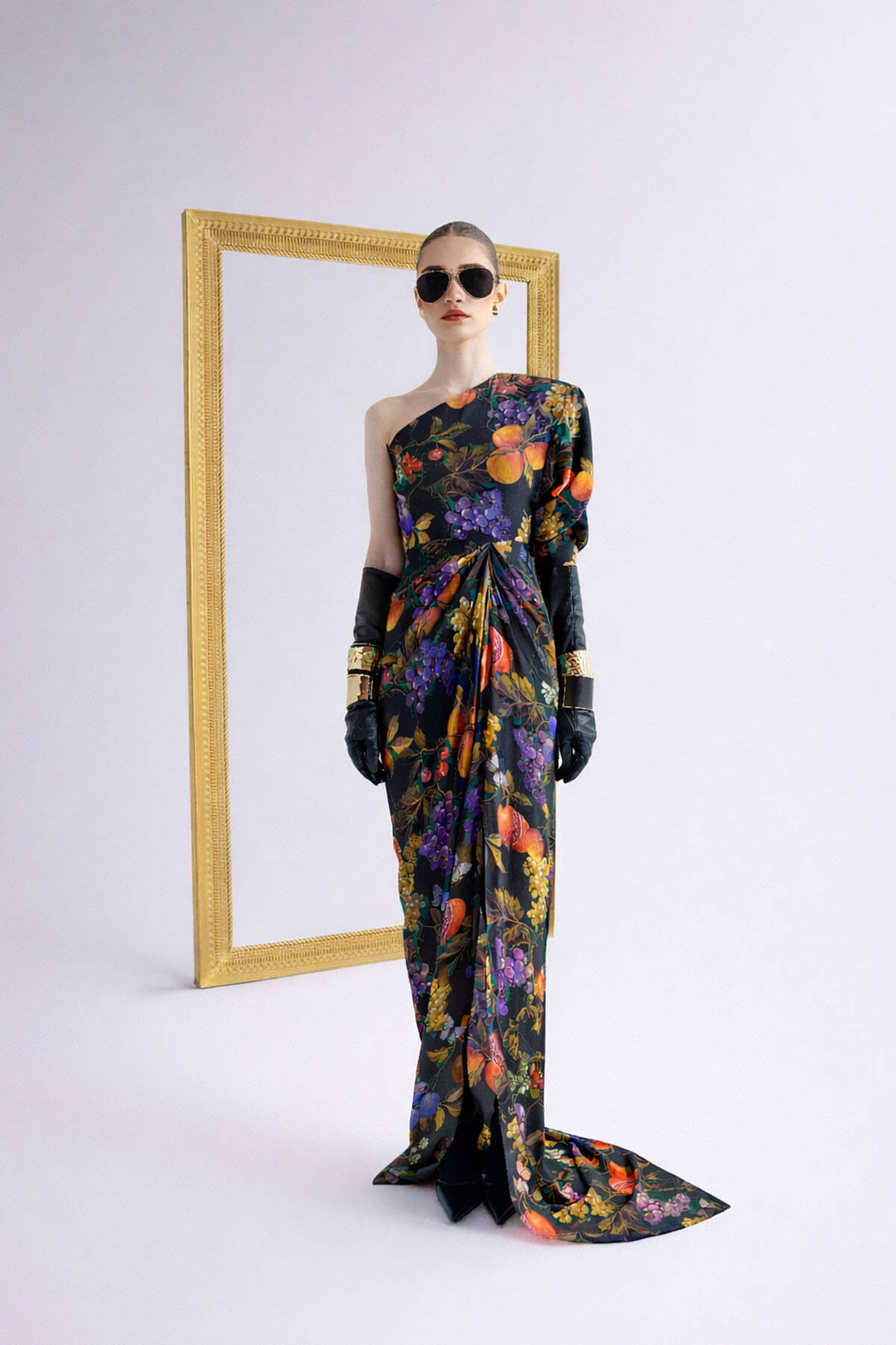 One shoulder draped dress with gathered sleeves and shoulder pads. Most of these images are AI generated, so there can be a slight difference.