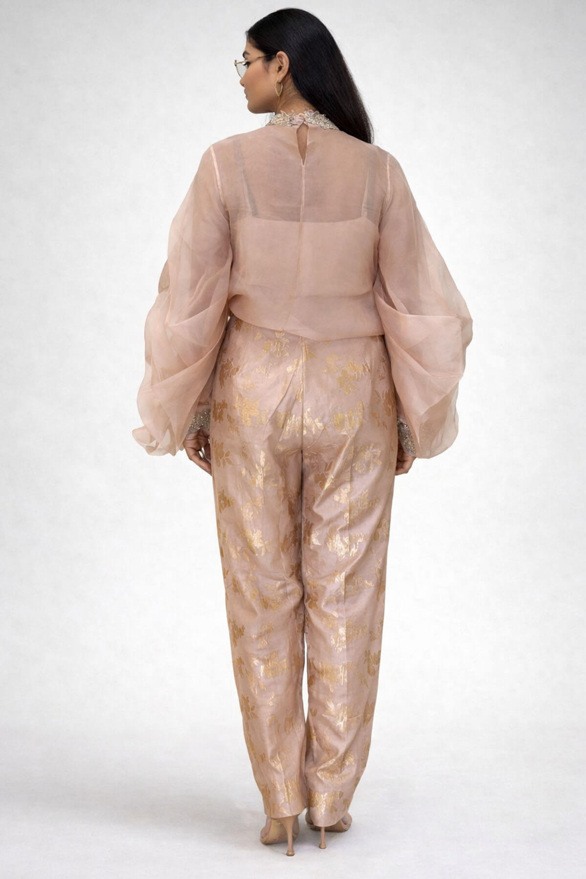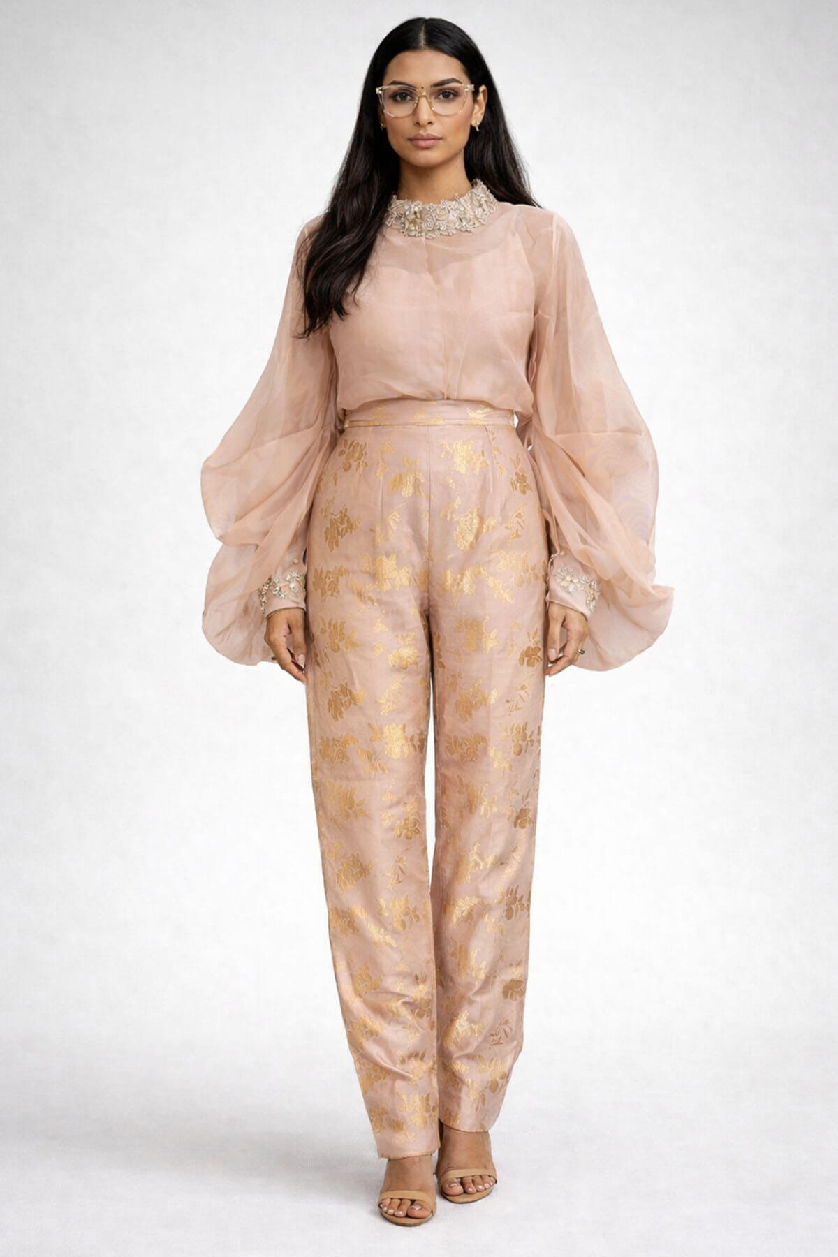 A 3 piece ensemble comprising of a slip, brocade printed pants and an organza embroidered top. Most of these images are AI generated, so there can be a slight difference.