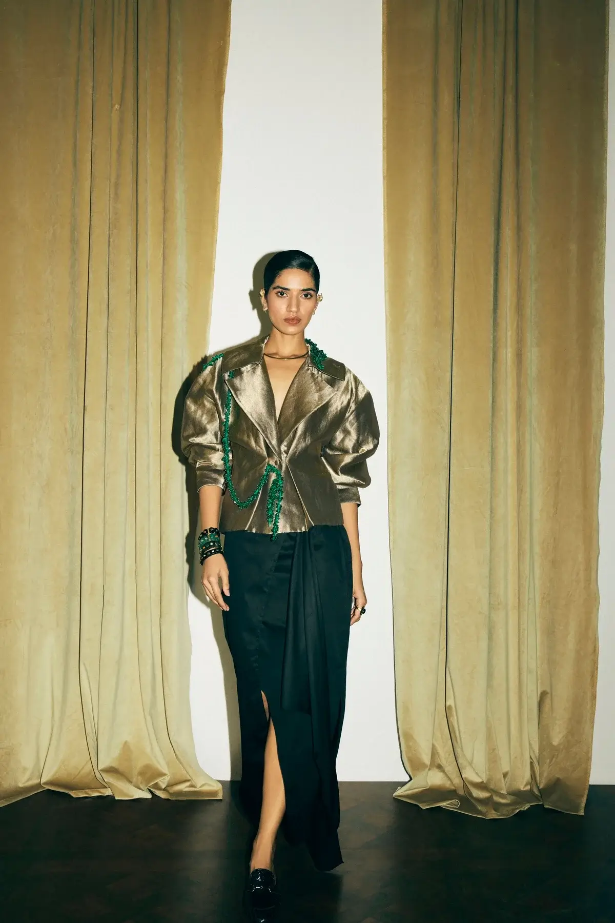 Our signature jacket with exaggerated sleeves and collar in gold brocade, embellished with green embroidery appliques and hangings.