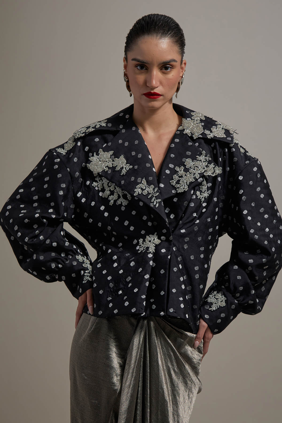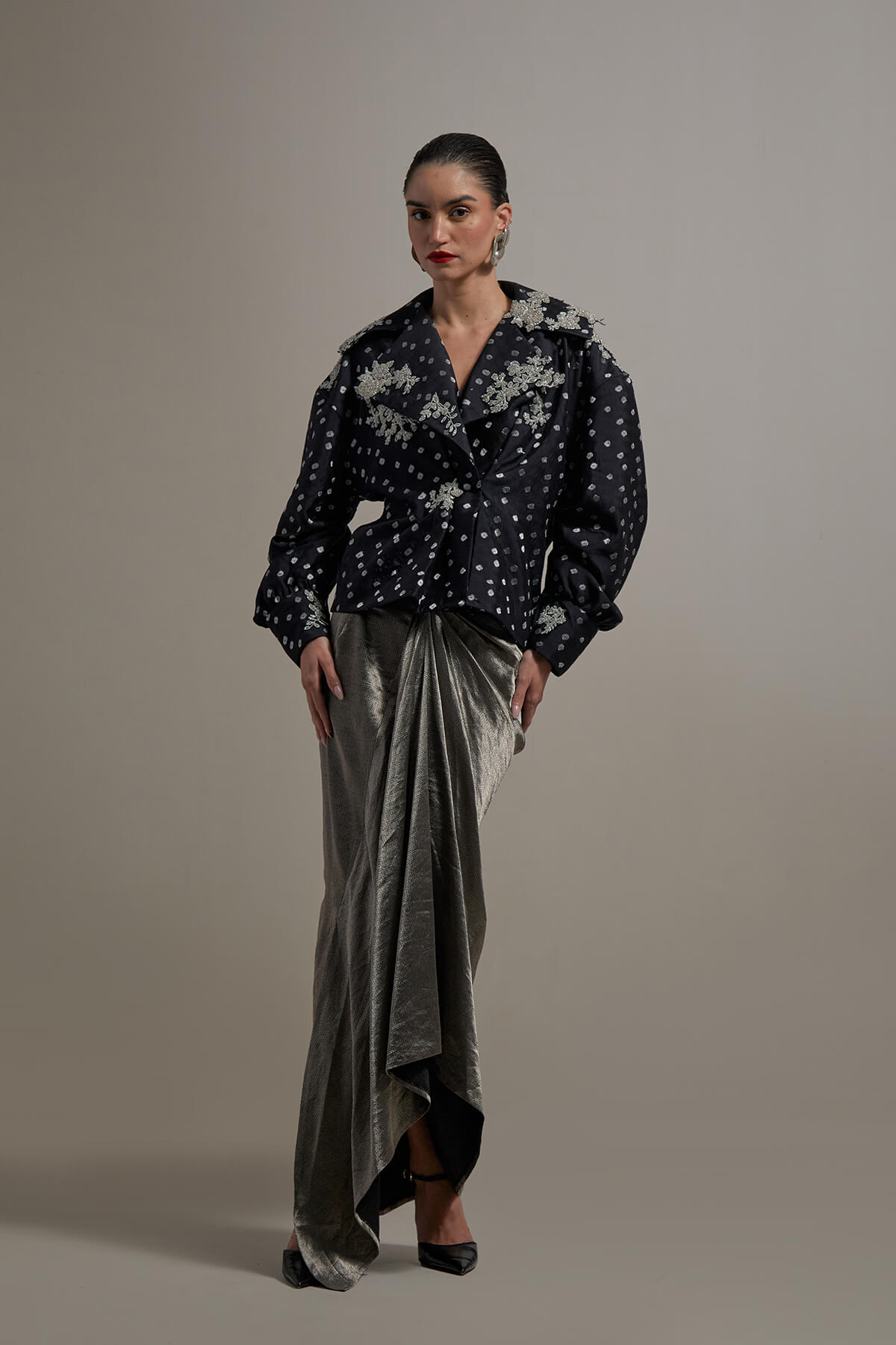A short silk jacket with front closure embellished with Silver coral moss appliques. A brocade draped skirt to pair with it.
