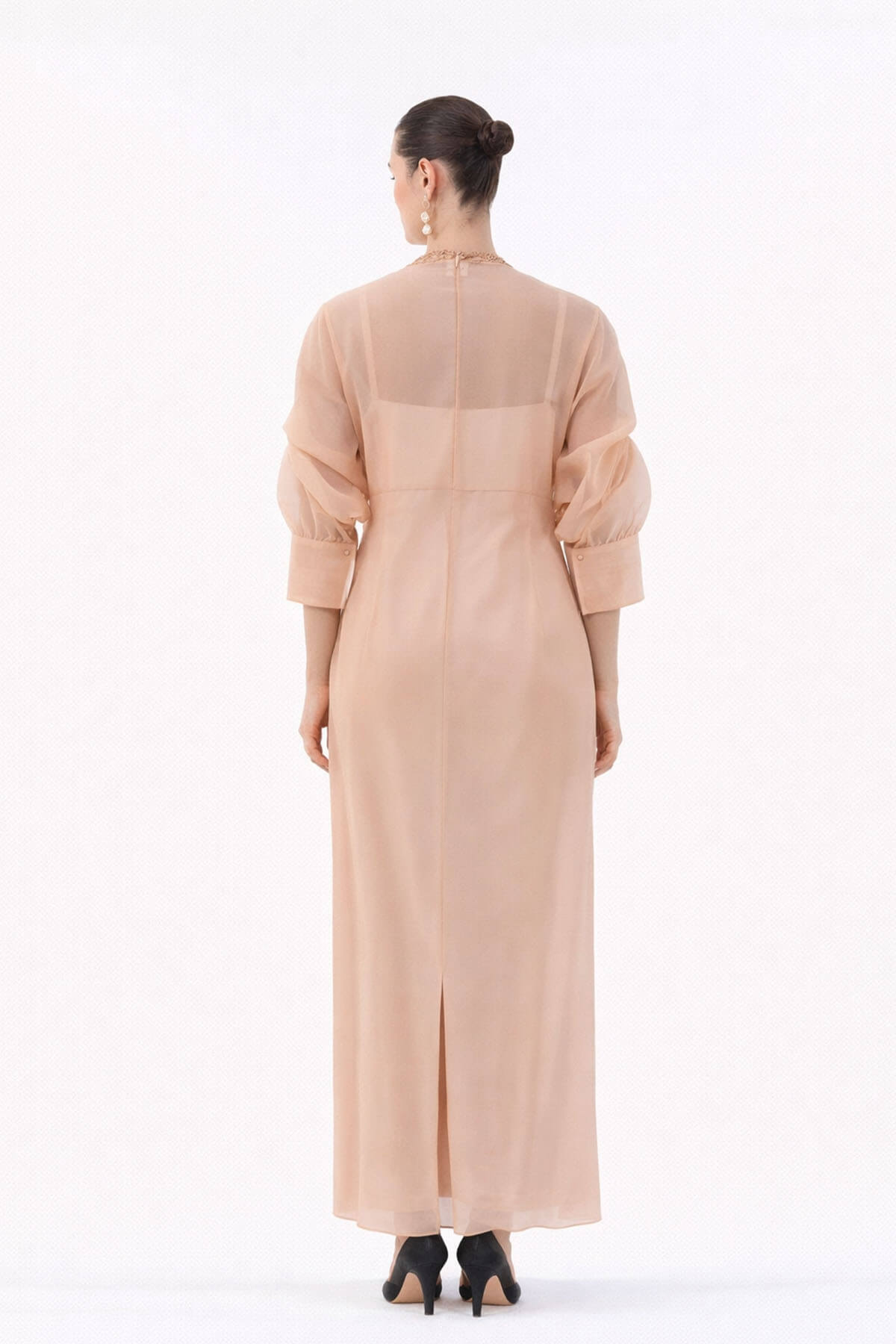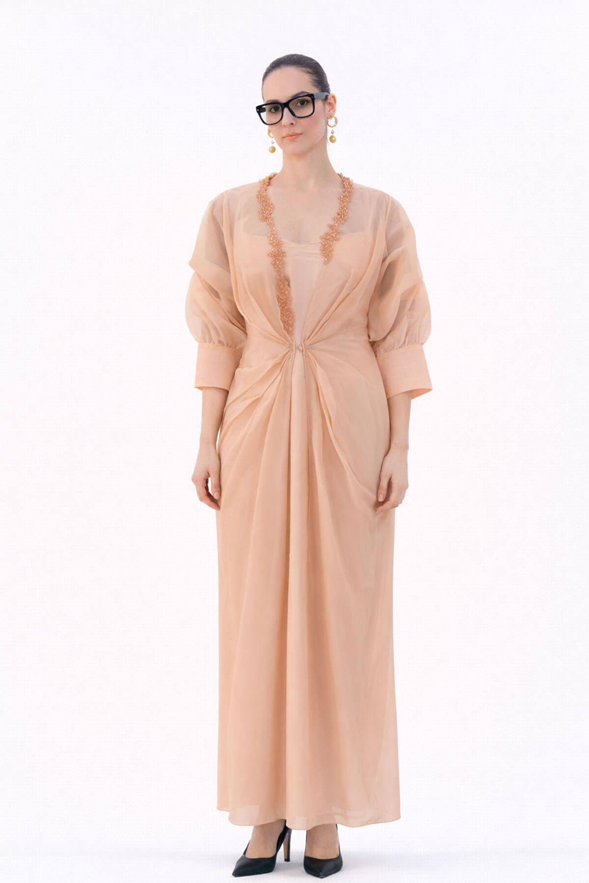A silk slip teamed with an embroidered organza jacket that sinches at the waist. Most of these images are AI generated, so there can be a slight difference.