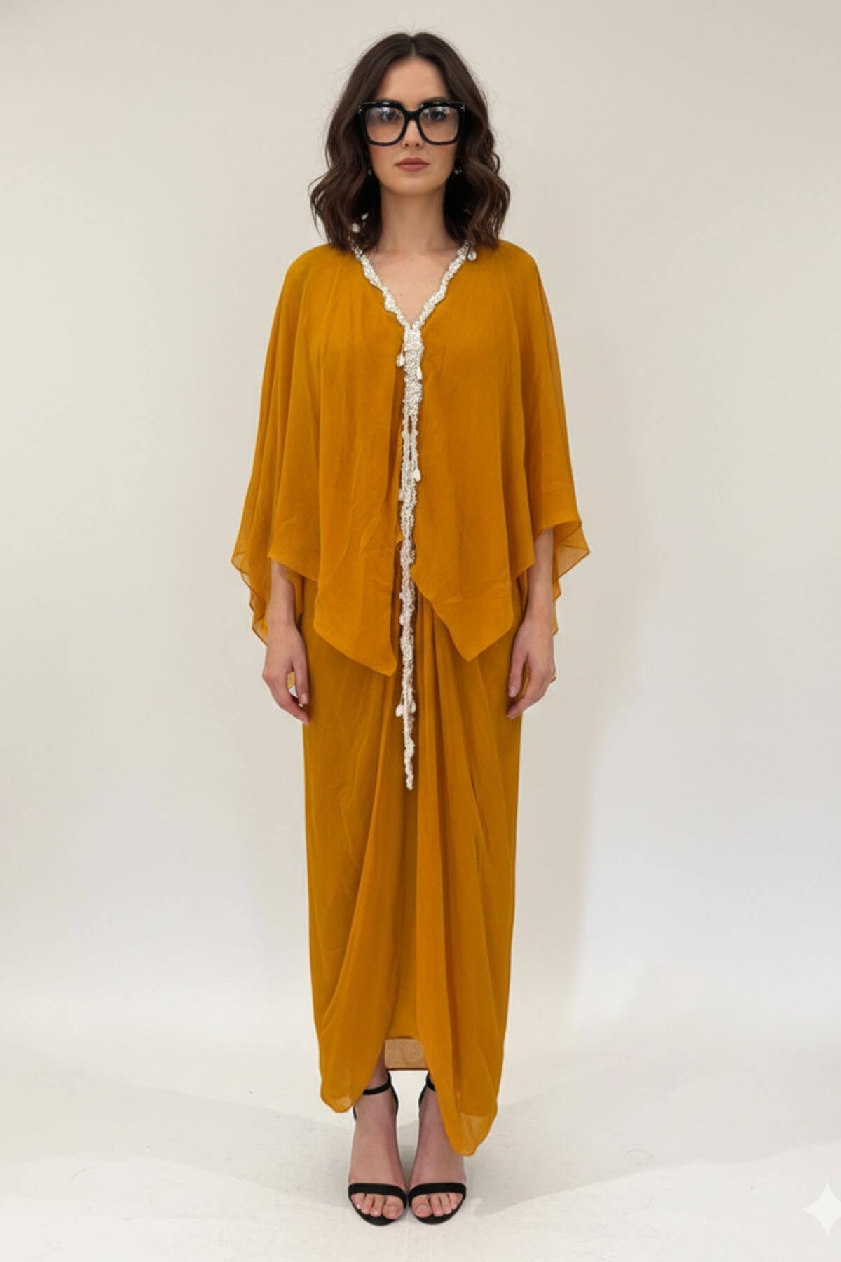 A long chiffon dress with embroidery around the neck. Most of these images are AI generated, so there can be a slight difference.