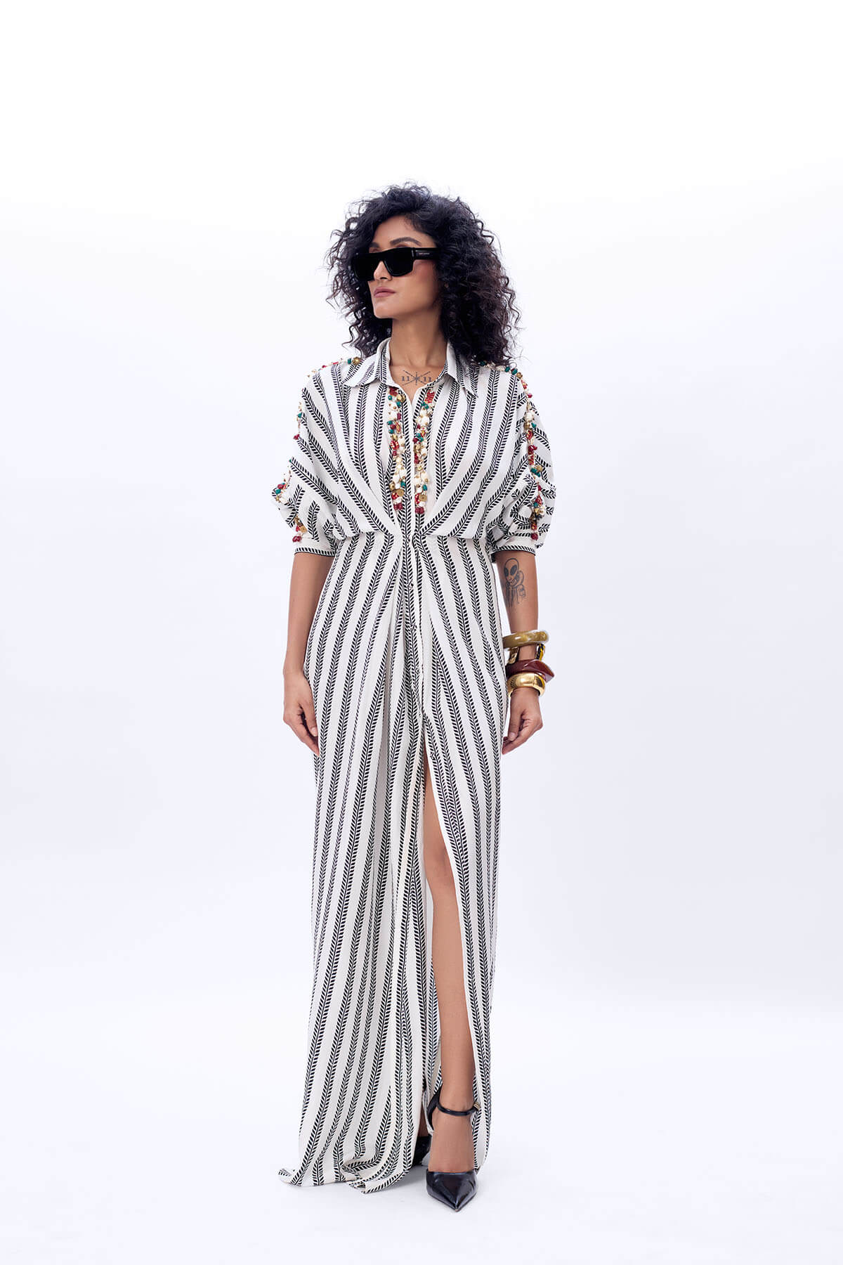 A long silk printed shirt dress with embroidery in the front. Most of these images are AI generated, so there can be a slight difference.