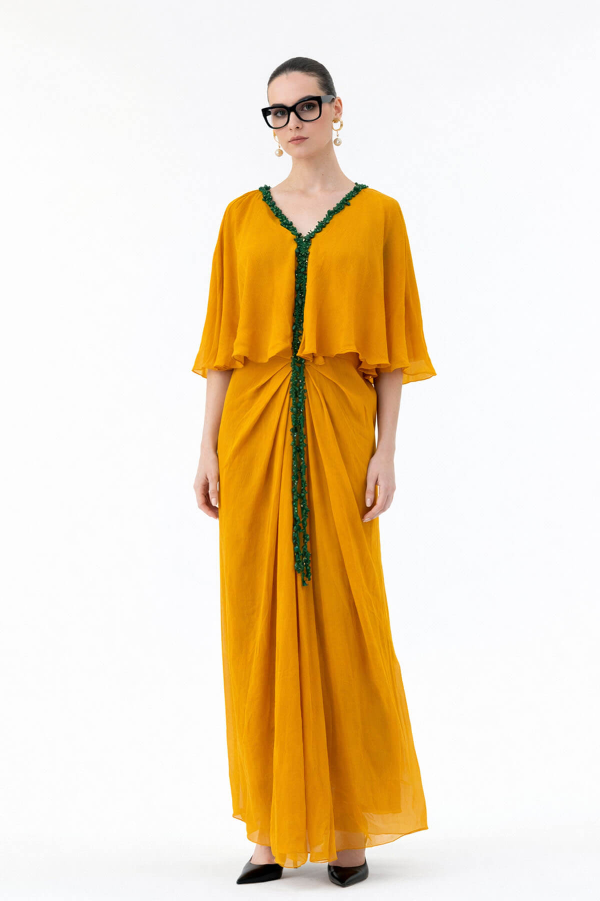 Chiffon dress with applique on it. Most of these images are AI generated, so there can be a slight difference.