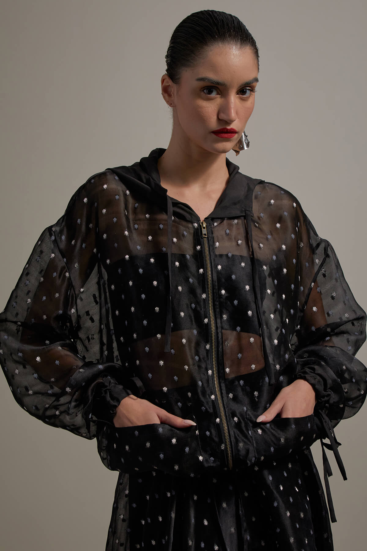 Bomber organza butta jacket, teamed with a silk bustier and a beautiful organza butta skirt
