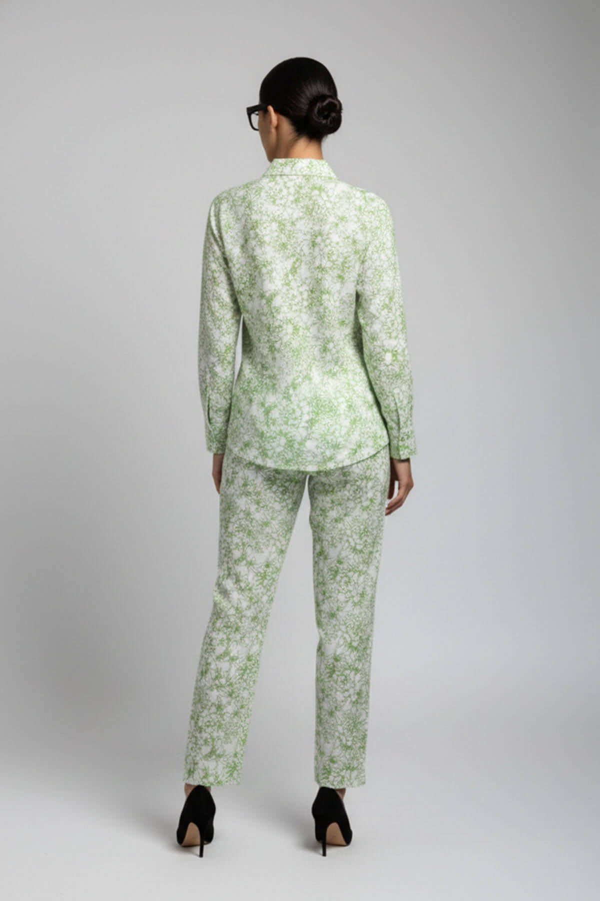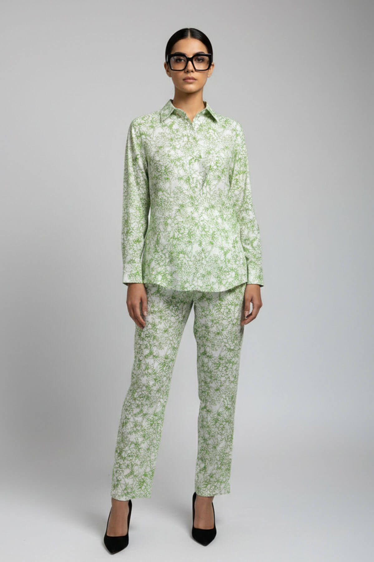 A 2 piece ensemble comprising of a silk printed shirt with sinching at the waist and silk pants. Most of these images are AI generated, so there can be a slight difference.