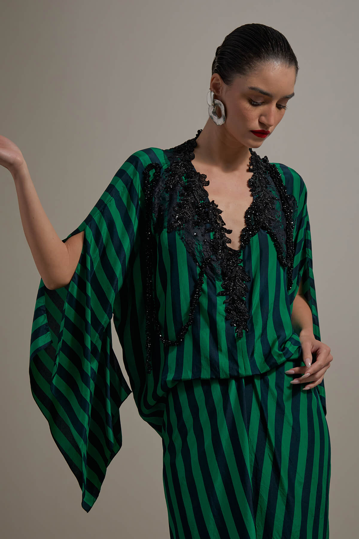 Draped dress in silk with Black lace applique details on the neck.