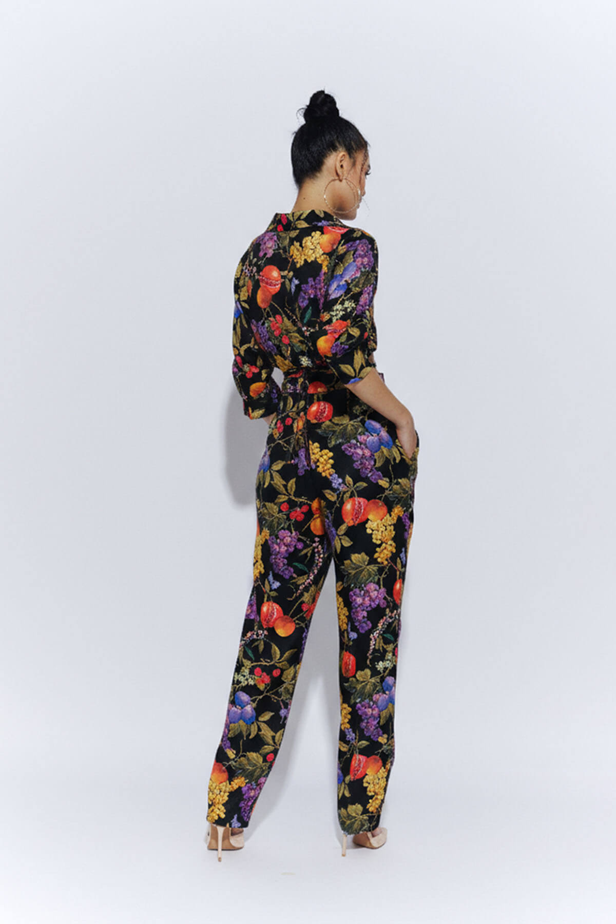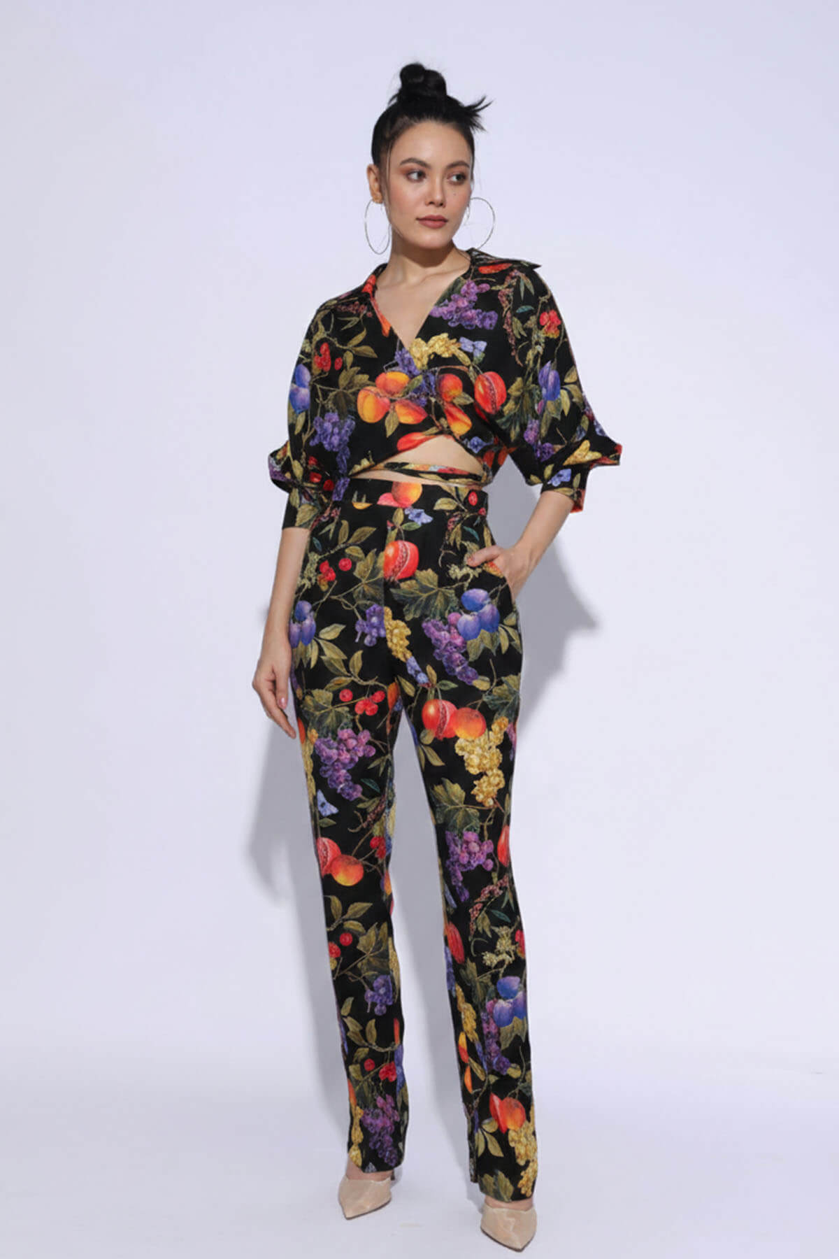 A crop shirt teamed with long silk printed pants. Most of these images are AI generated, so there can be a slight difference.