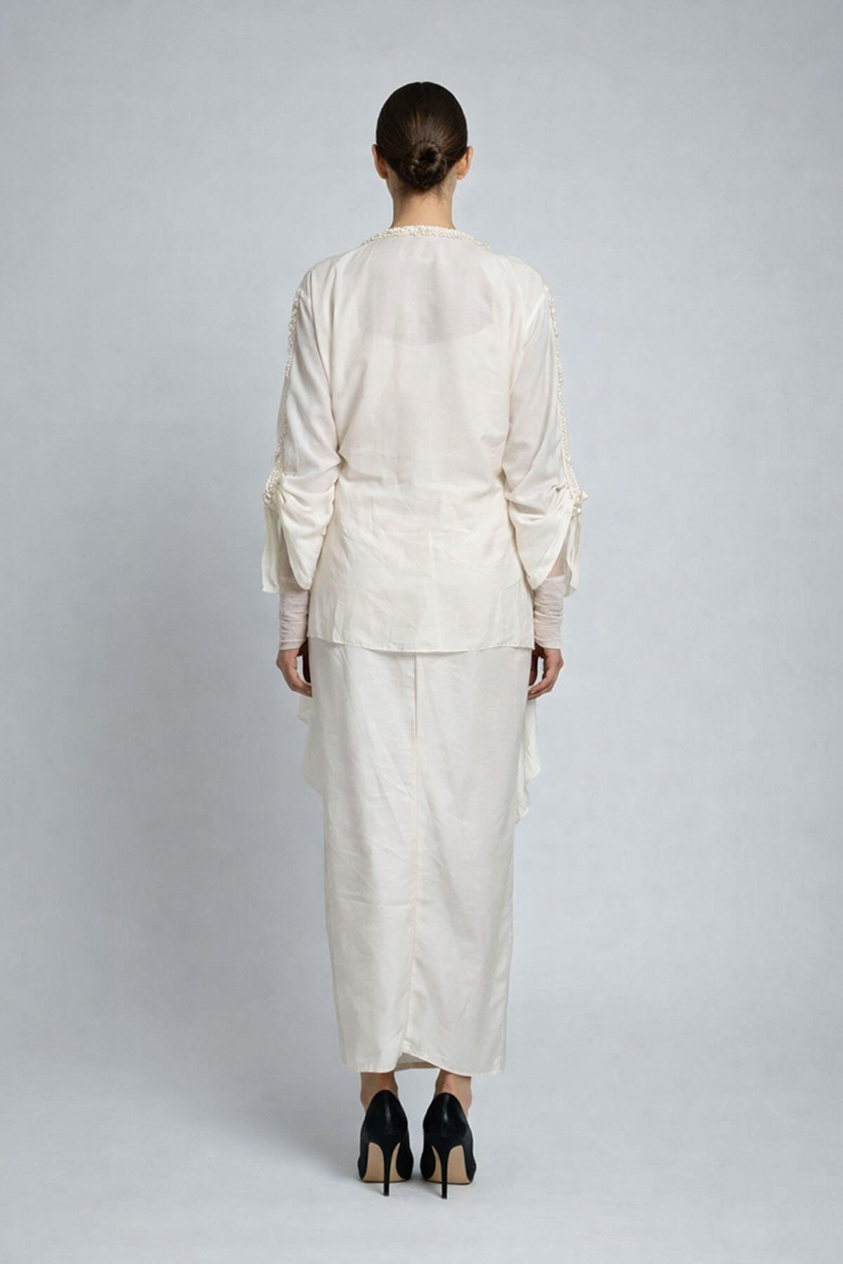 A 3 piece ensemble comprising of a slip, silk short jacket & drape skirt. Most of these images are AI generated, so there can be a slight difference.