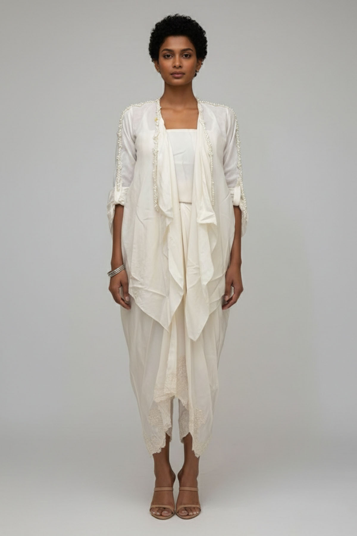Embroidered silk jacket with slip and skirt with lace on the hem. Most of these images are AI generated, so there can be a slight difference.