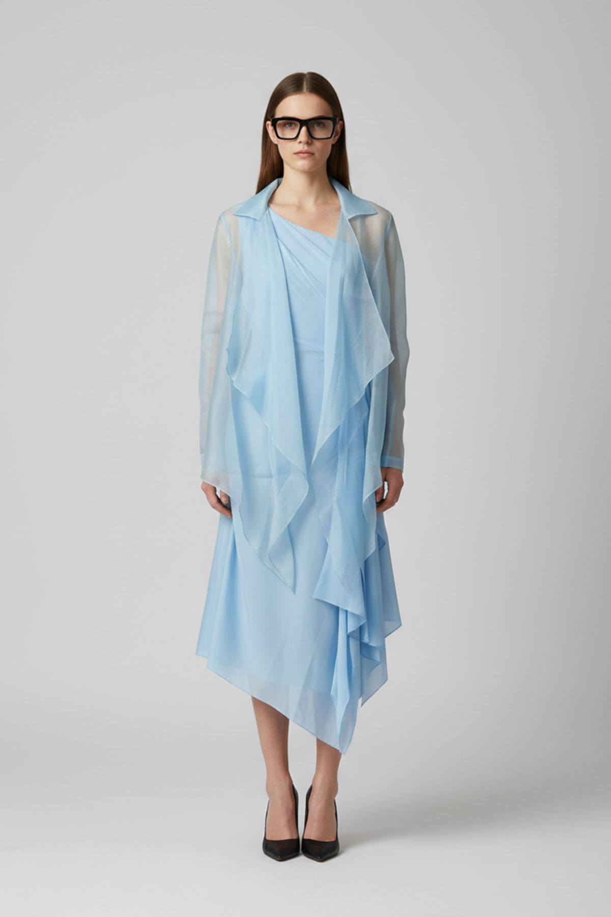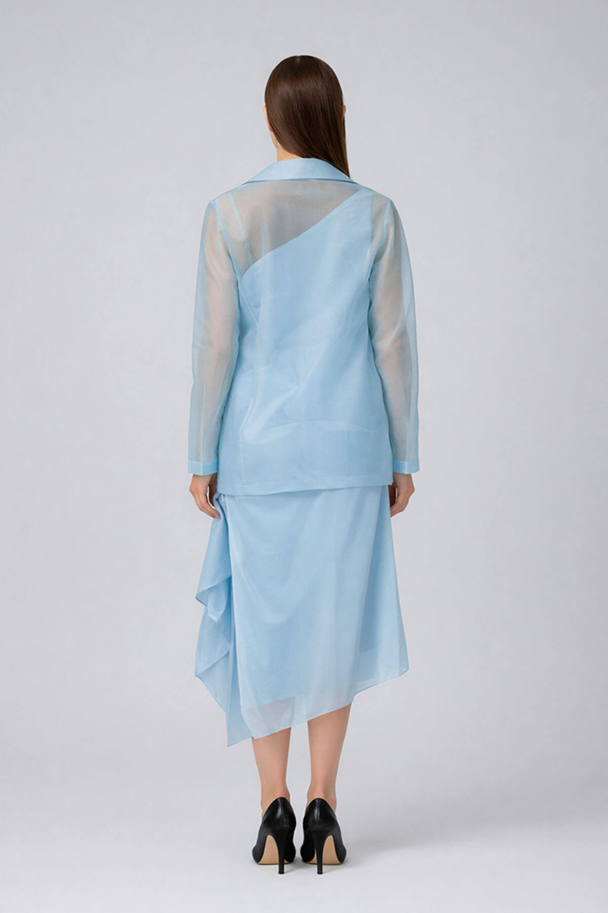 A 2 piece set including an assymetric one shoulder dress with an organza short jacket on top and belt. Most of these images are AI generated, so there can be a slight difference.