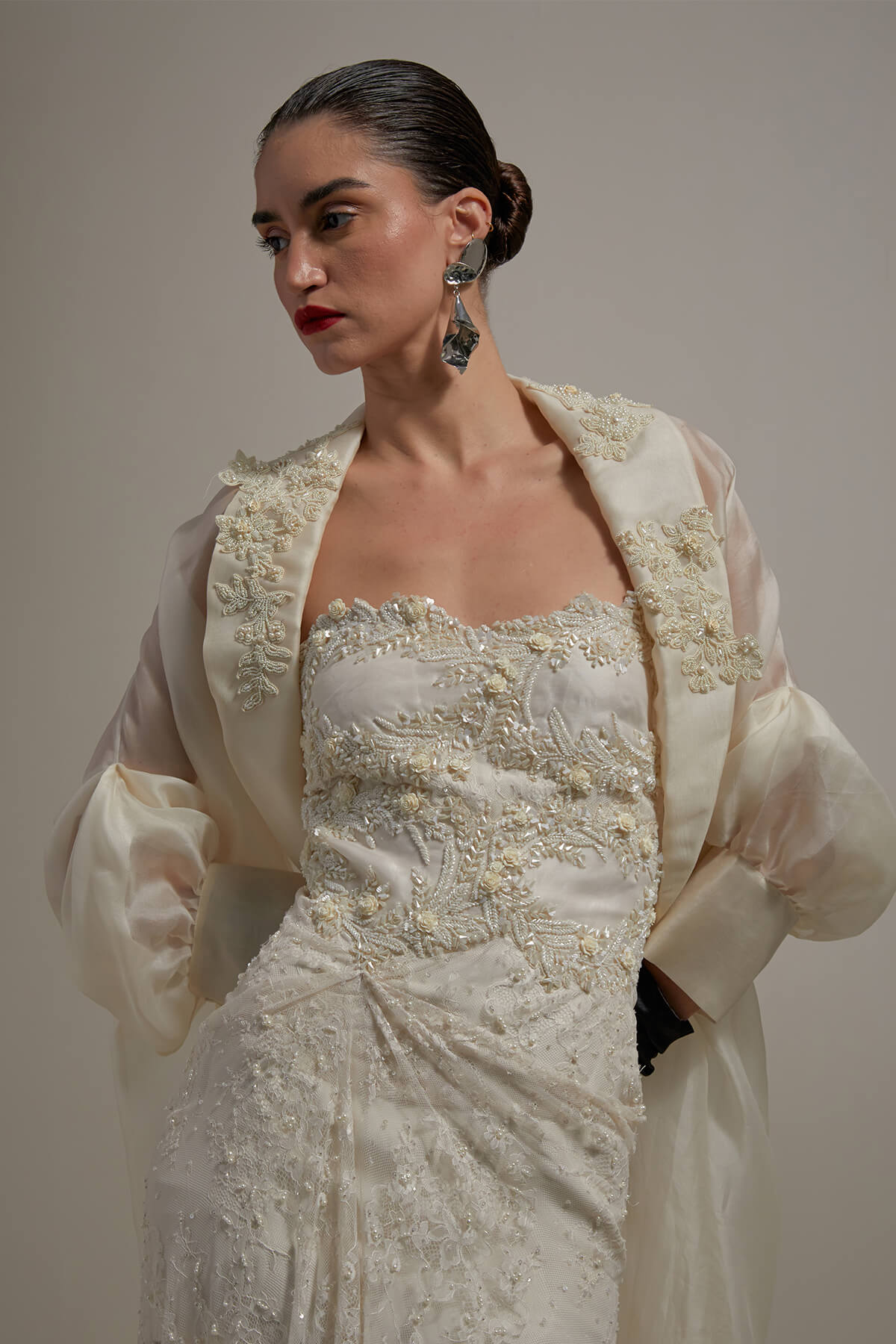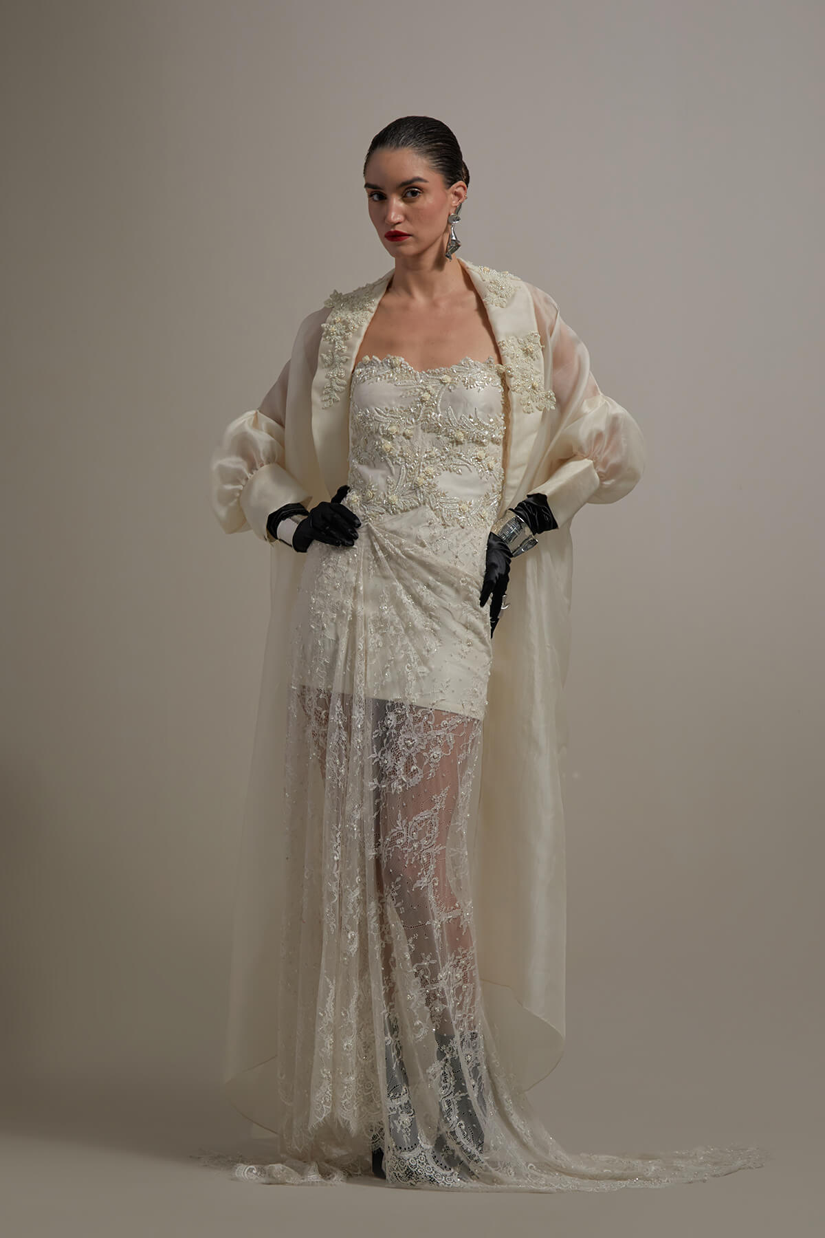 Embroidered Audrey dress in lace teamed with embroidered organza cape
