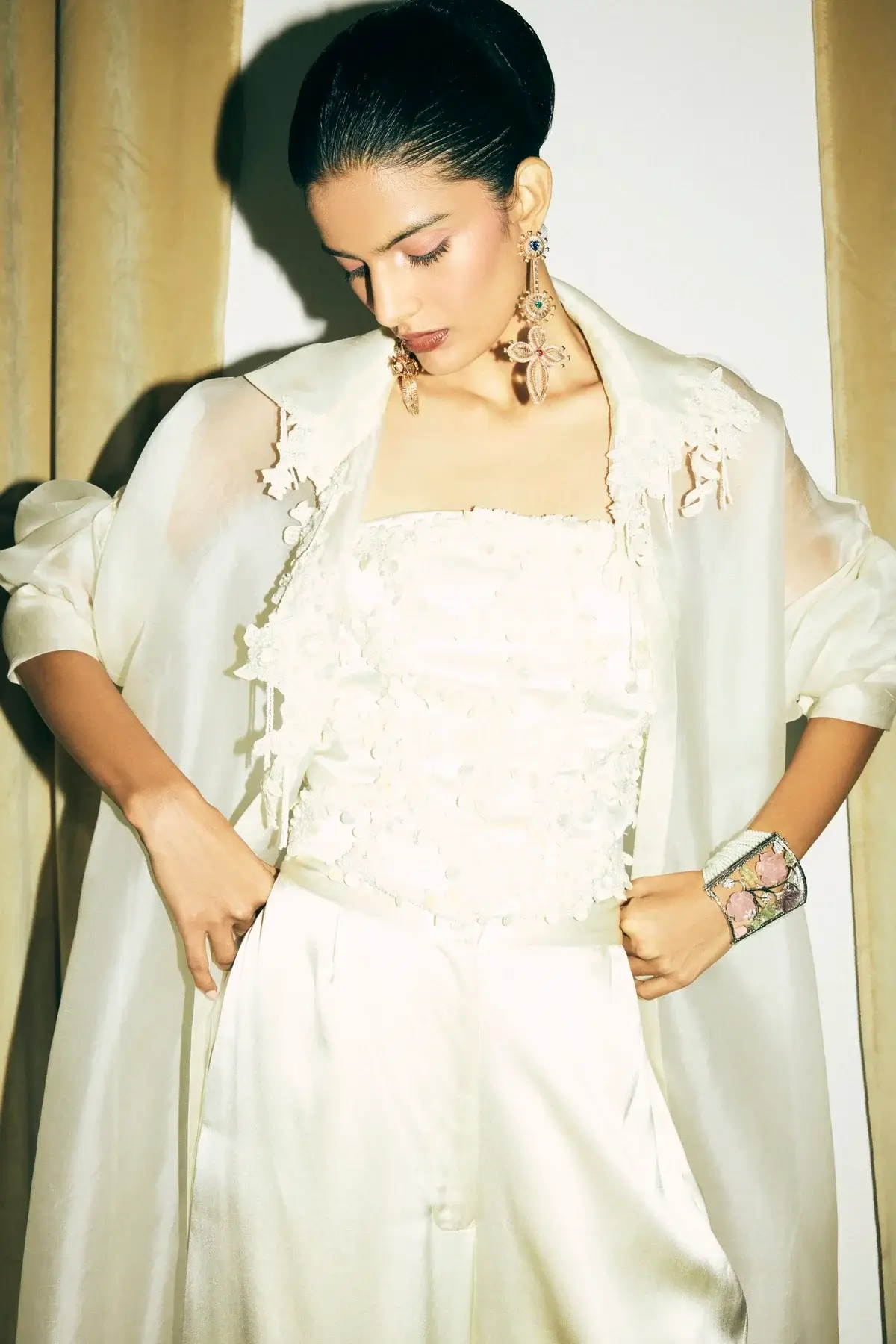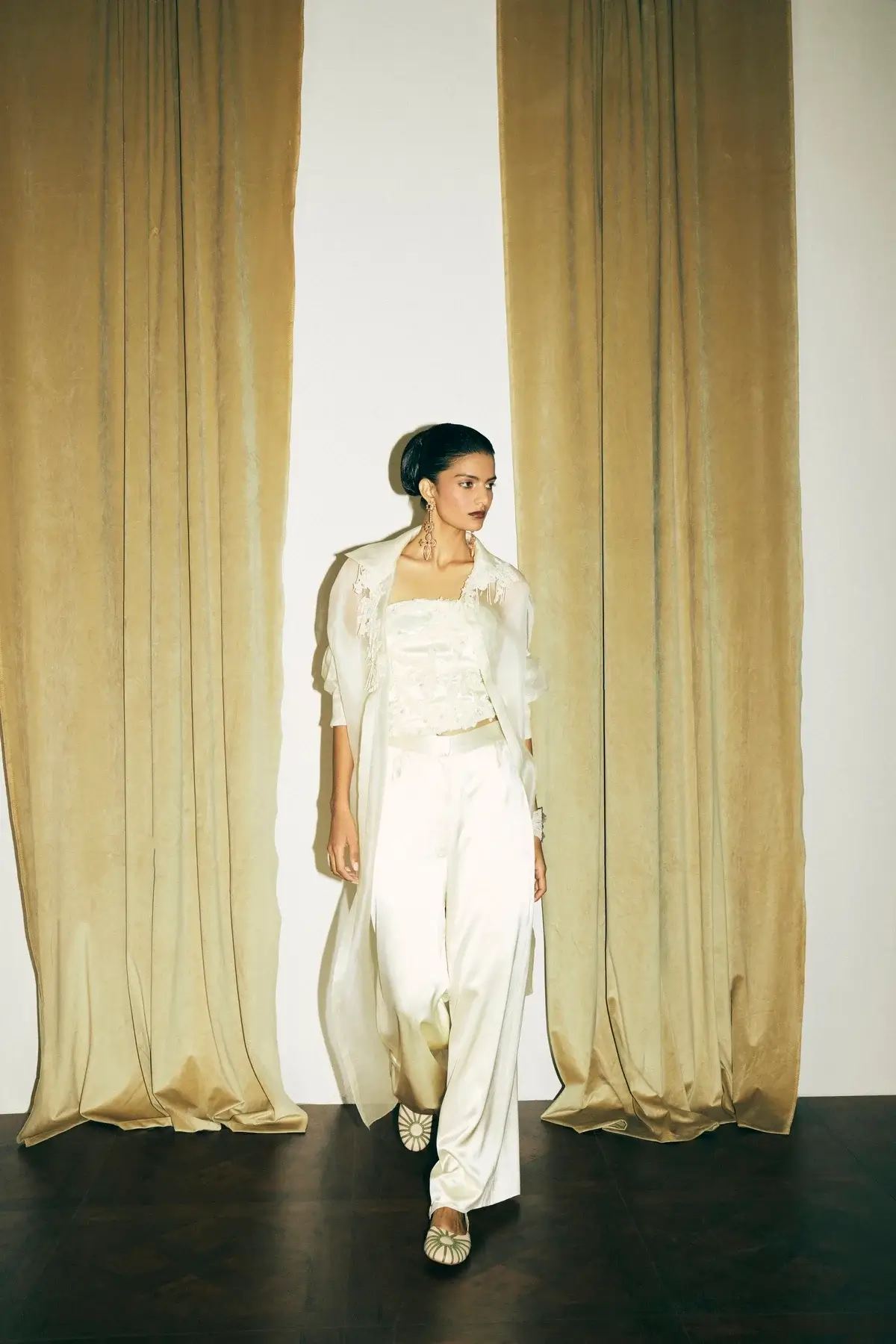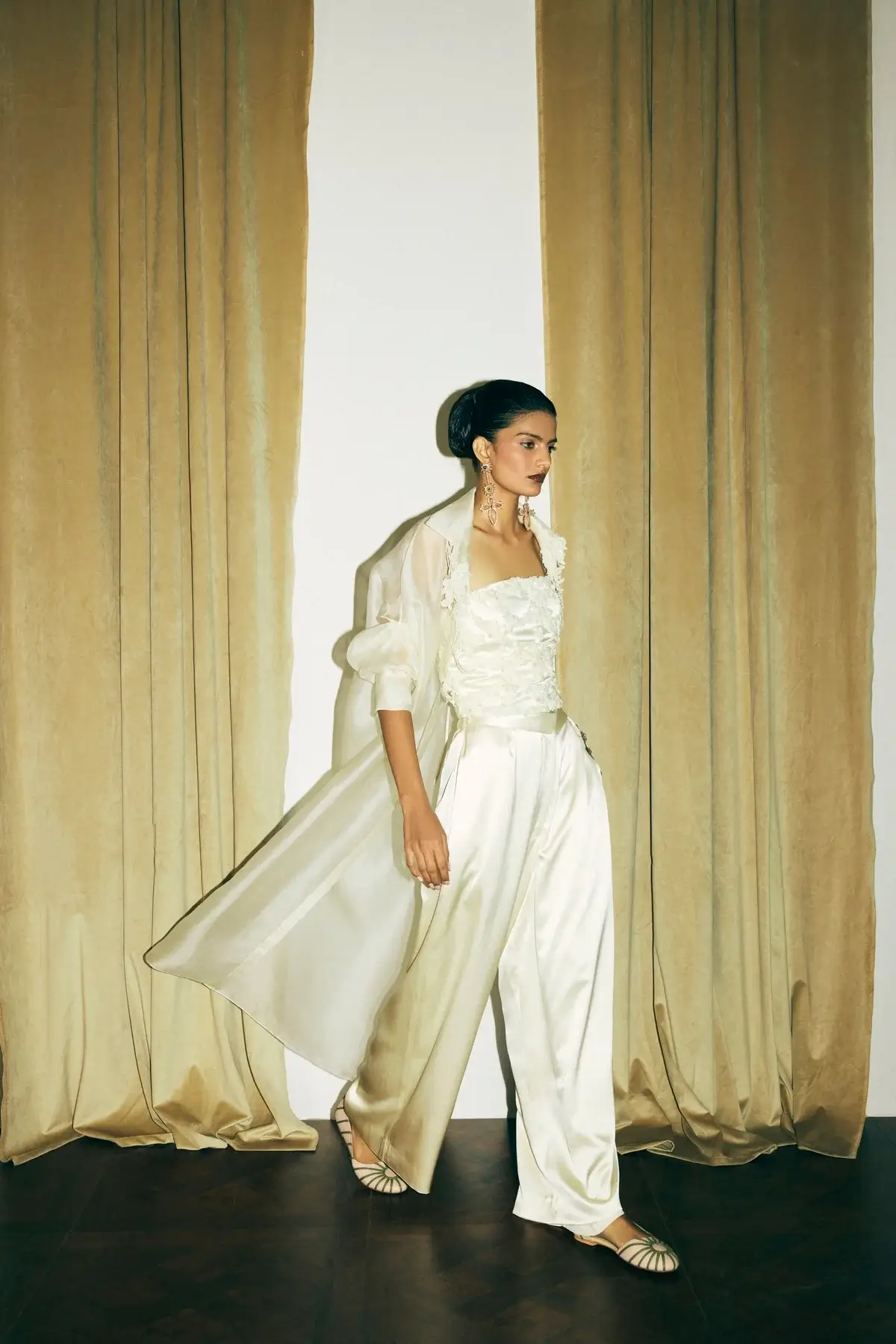 A heavy satin corset embellished with pearls and cut shells paired with an organza jacket with pearl appliques and hangings on the collar. Broad satin pants to pair with it.