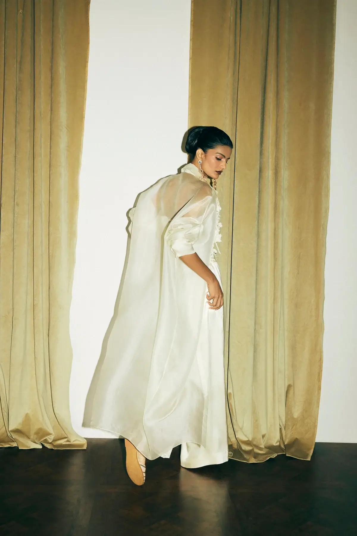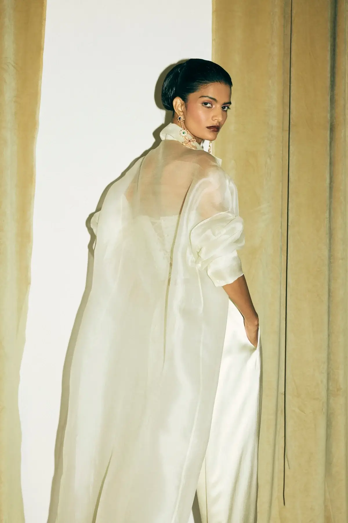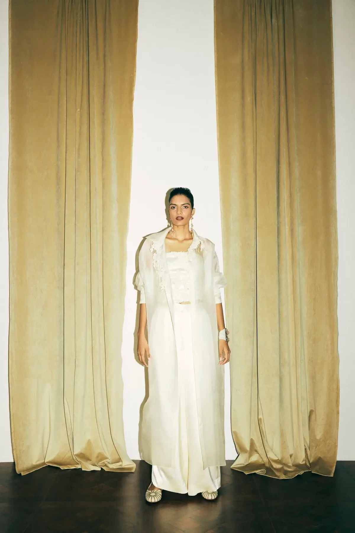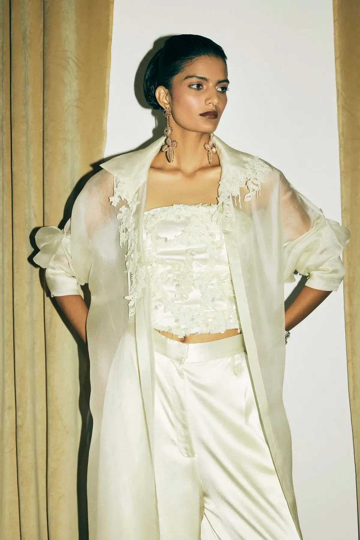 A heavy satin corset embellished with pearls and cut shells paired with an organza jacket with pearl appliques and hangings on the collar. Broad satin pants to pair with it.