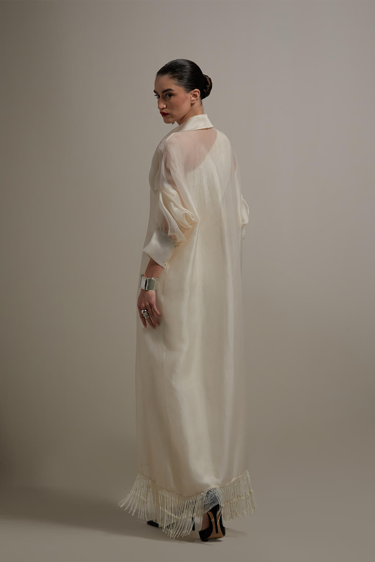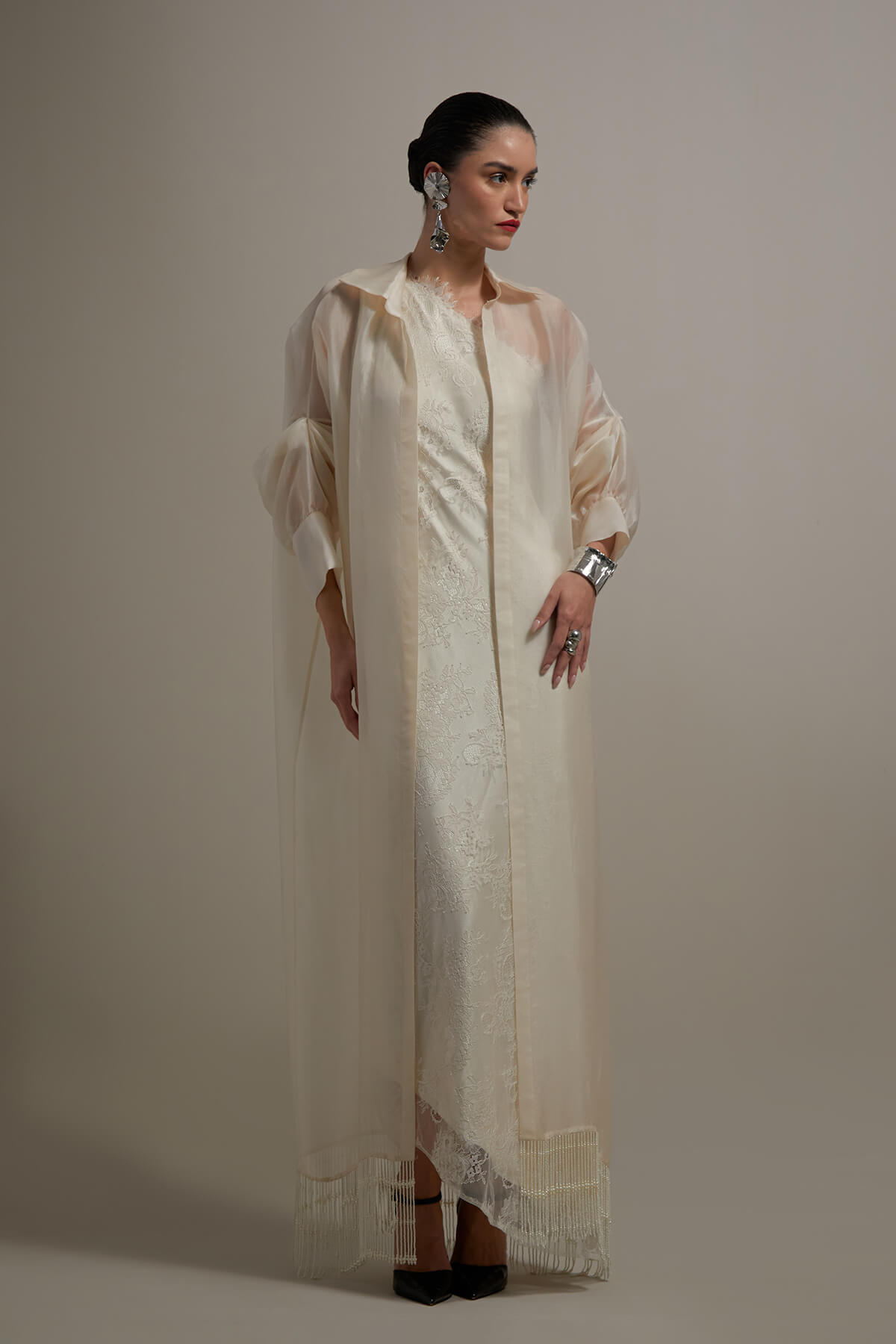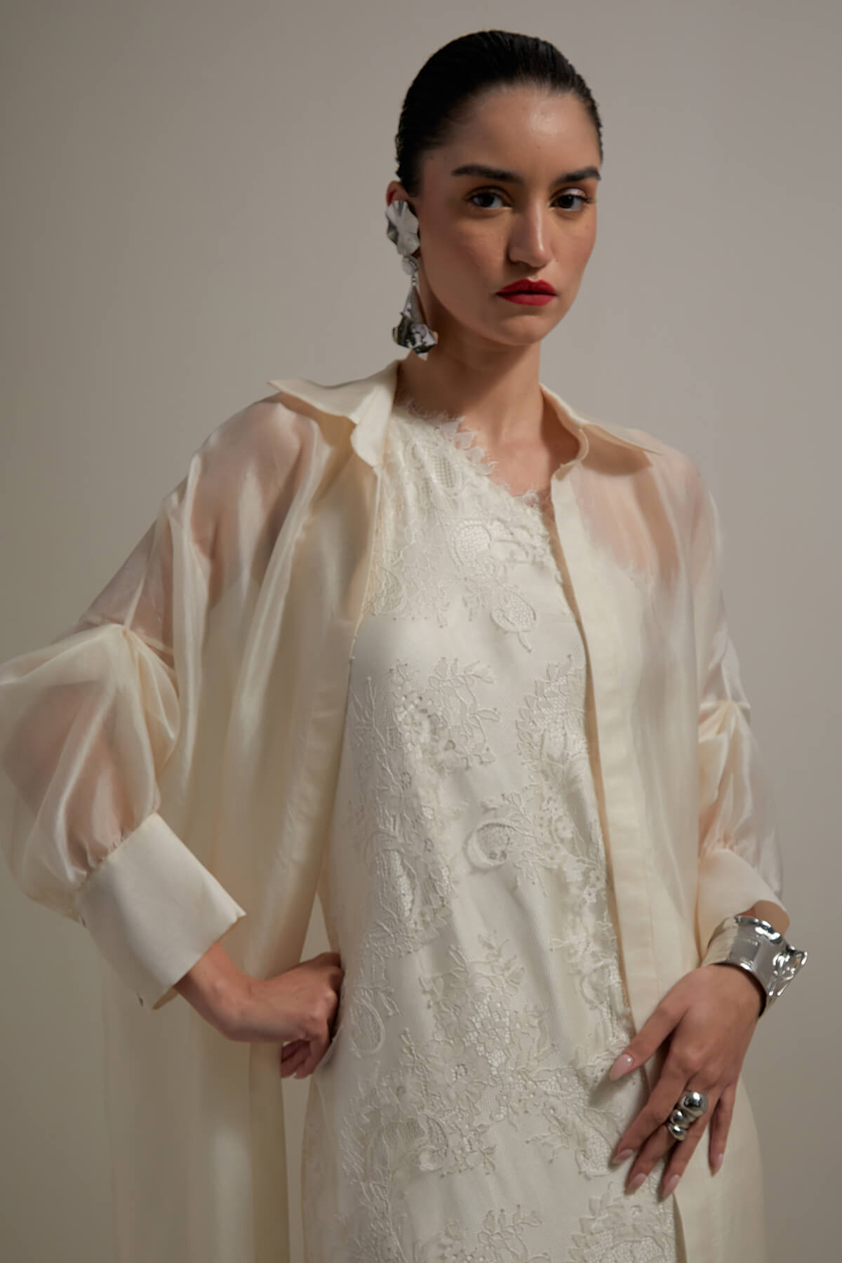 A two piece ensemble comprising of a one shoulder dress with hangings and an organza embroidered Jacket.