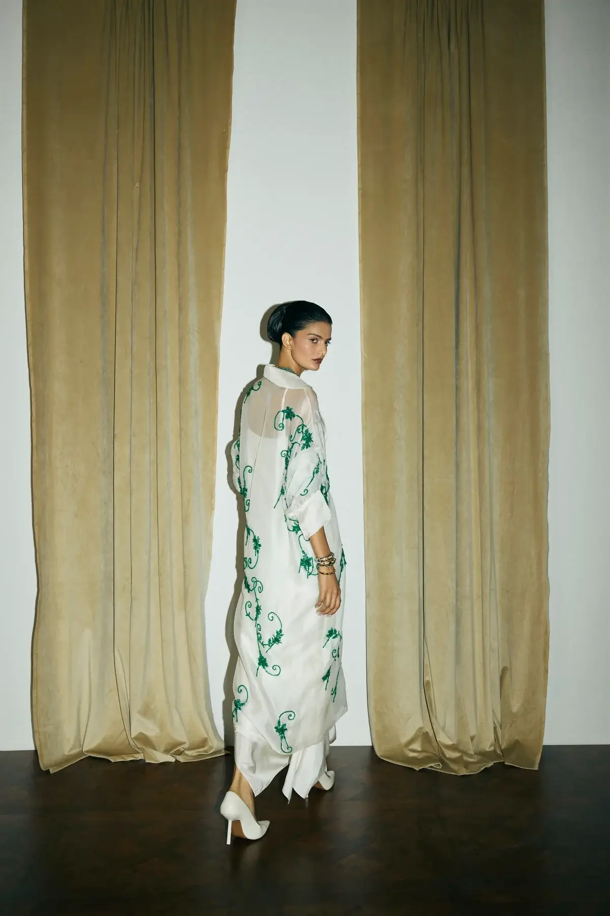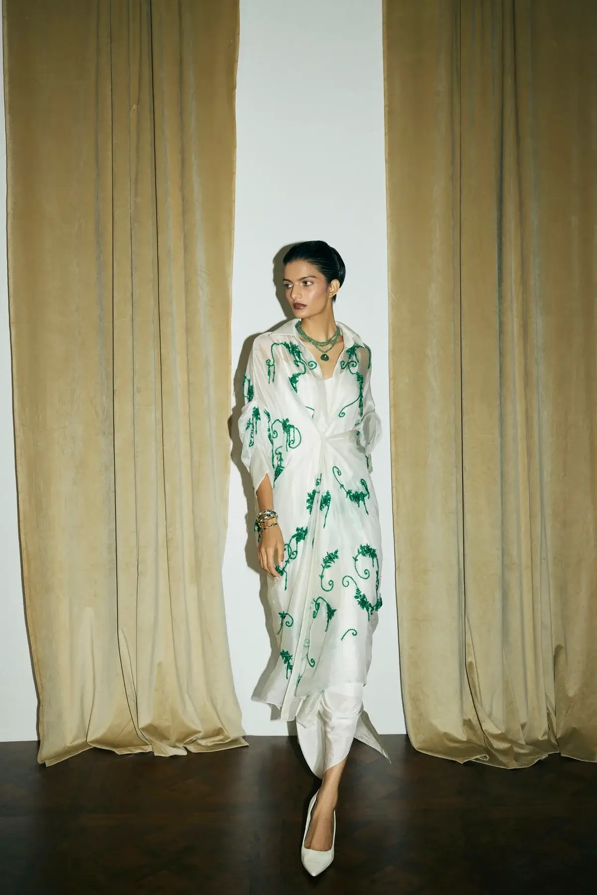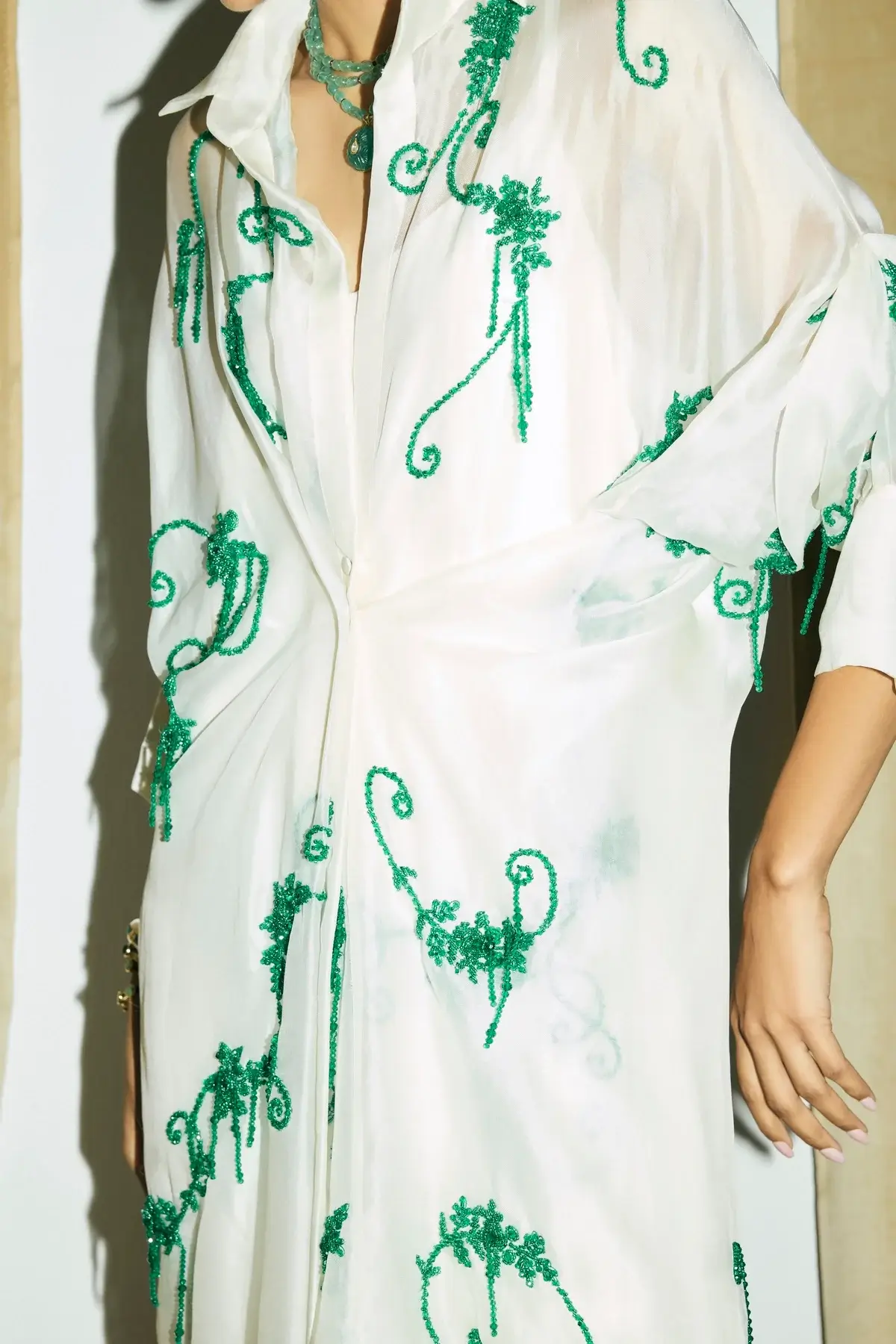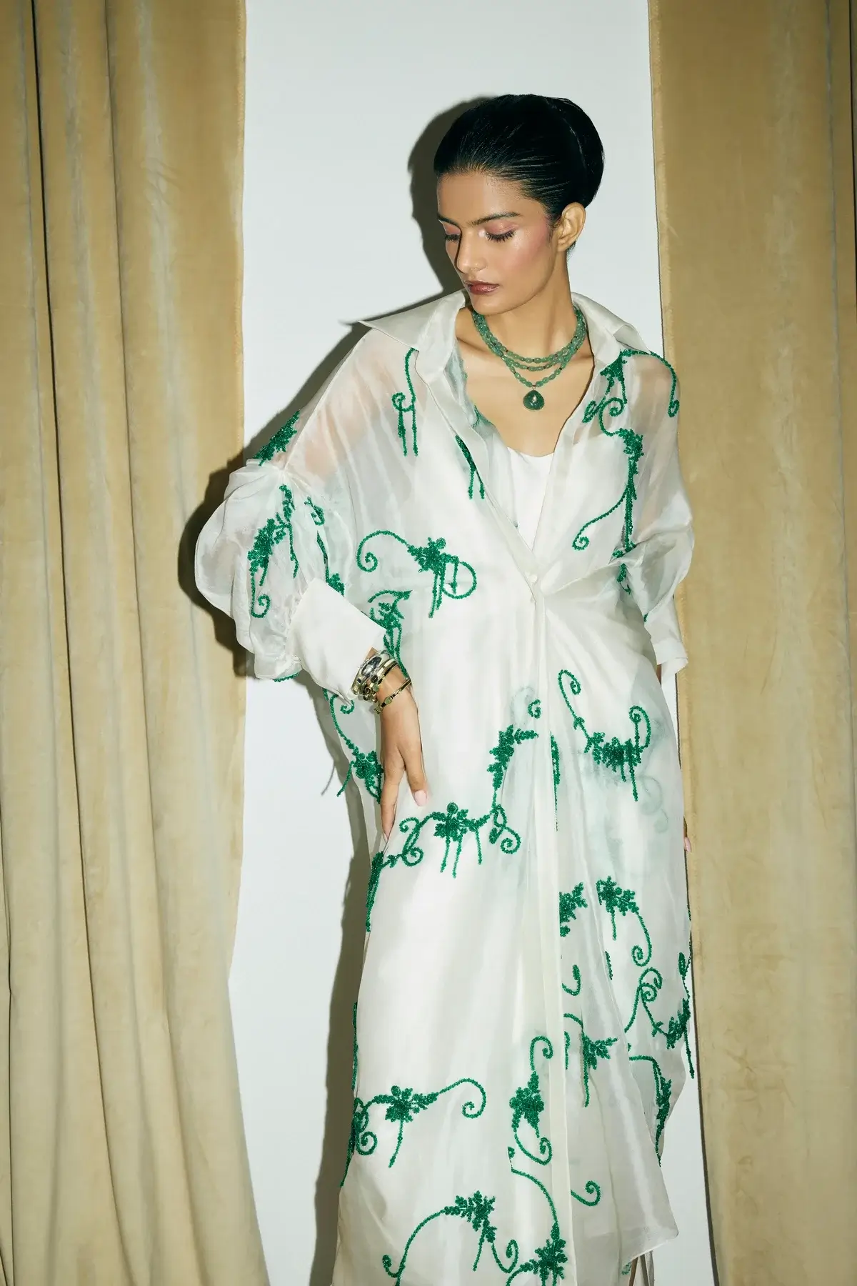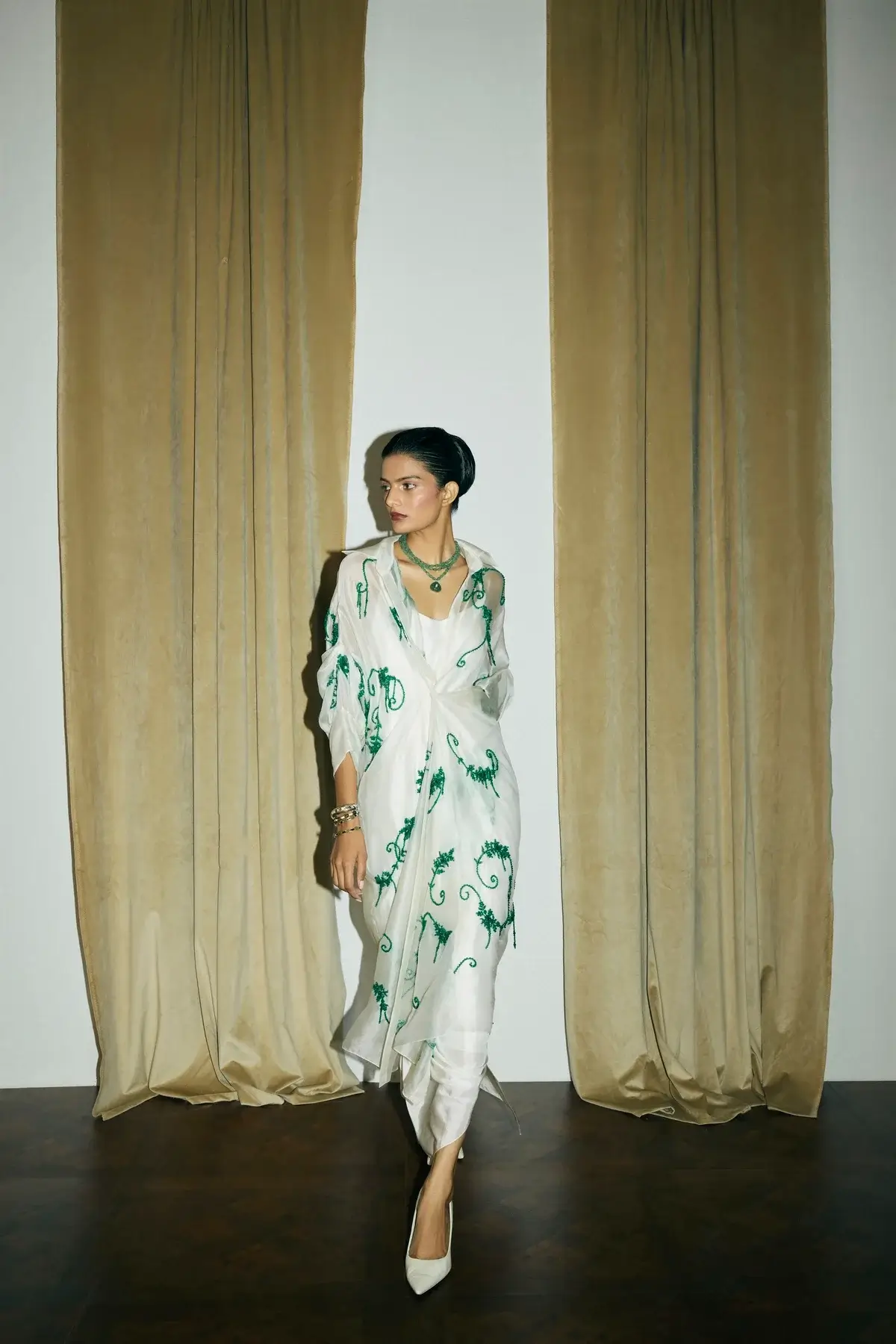 Ivory organza jacket with emerald green embellishments all over with front closure and signature sleeves. A drape silk dress to pair with it.