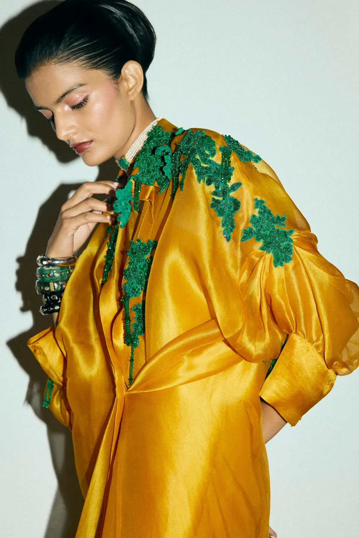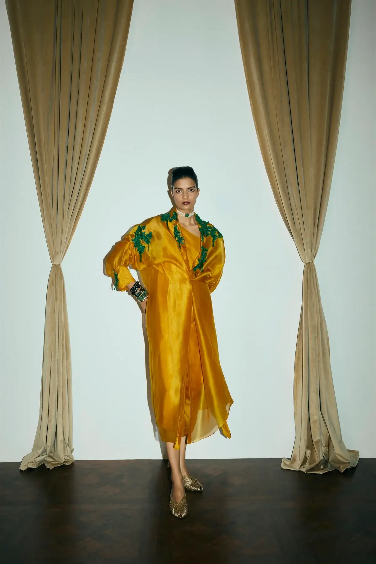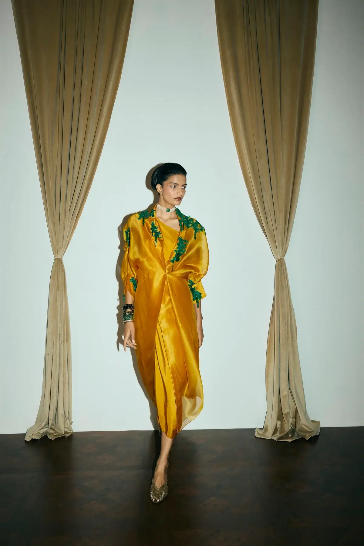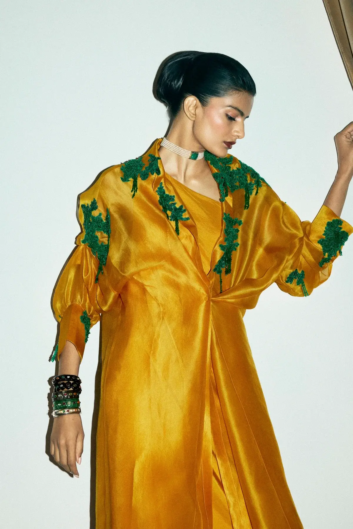 Ivory organza jacket with emerald green coral & moss inspired embellishments all over with front closure and signature sleeves. A silk drape dress to pair with it.