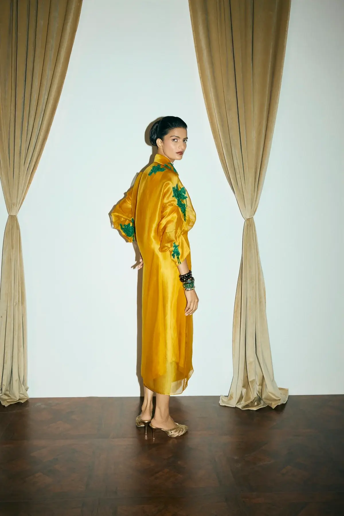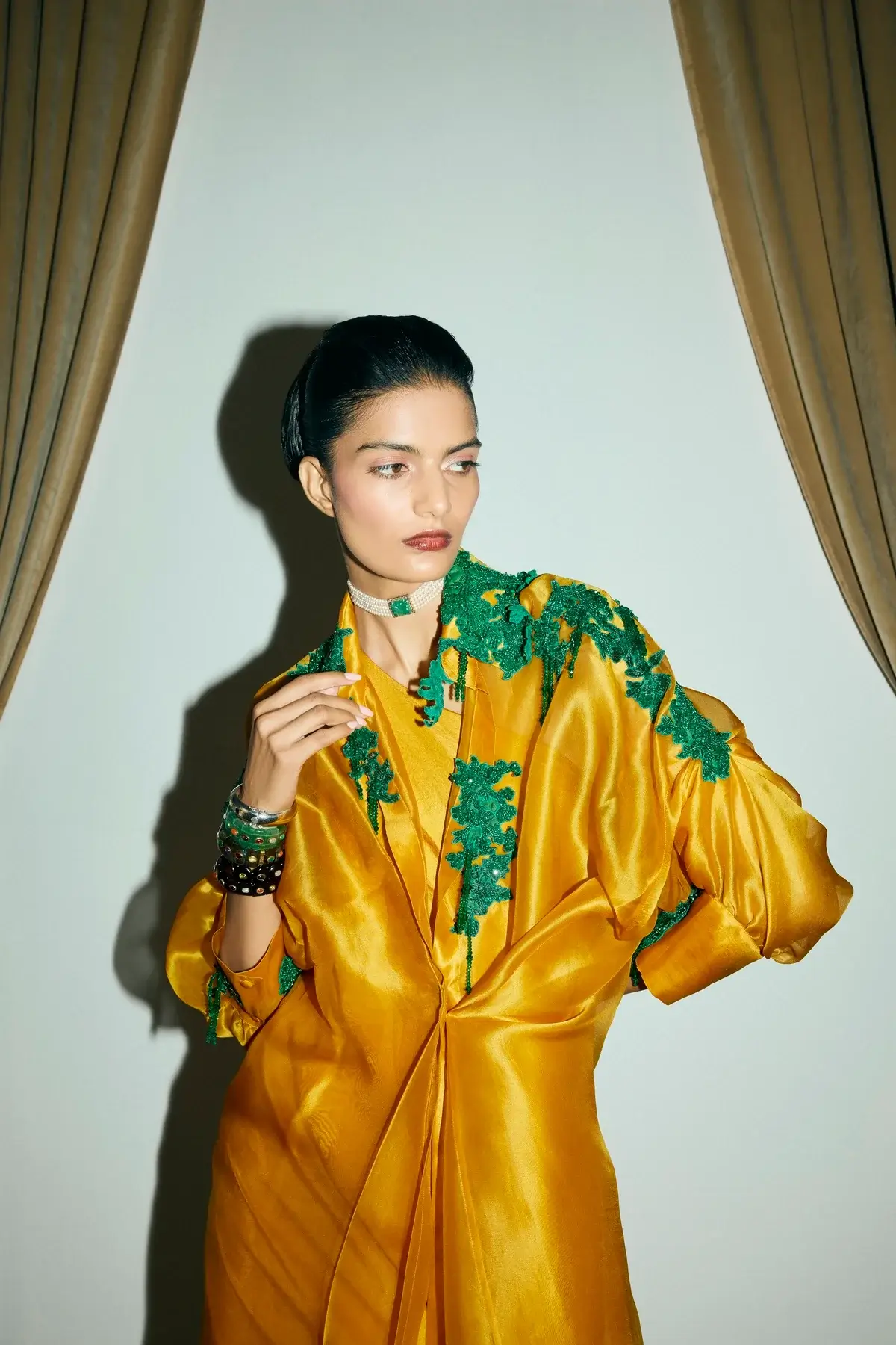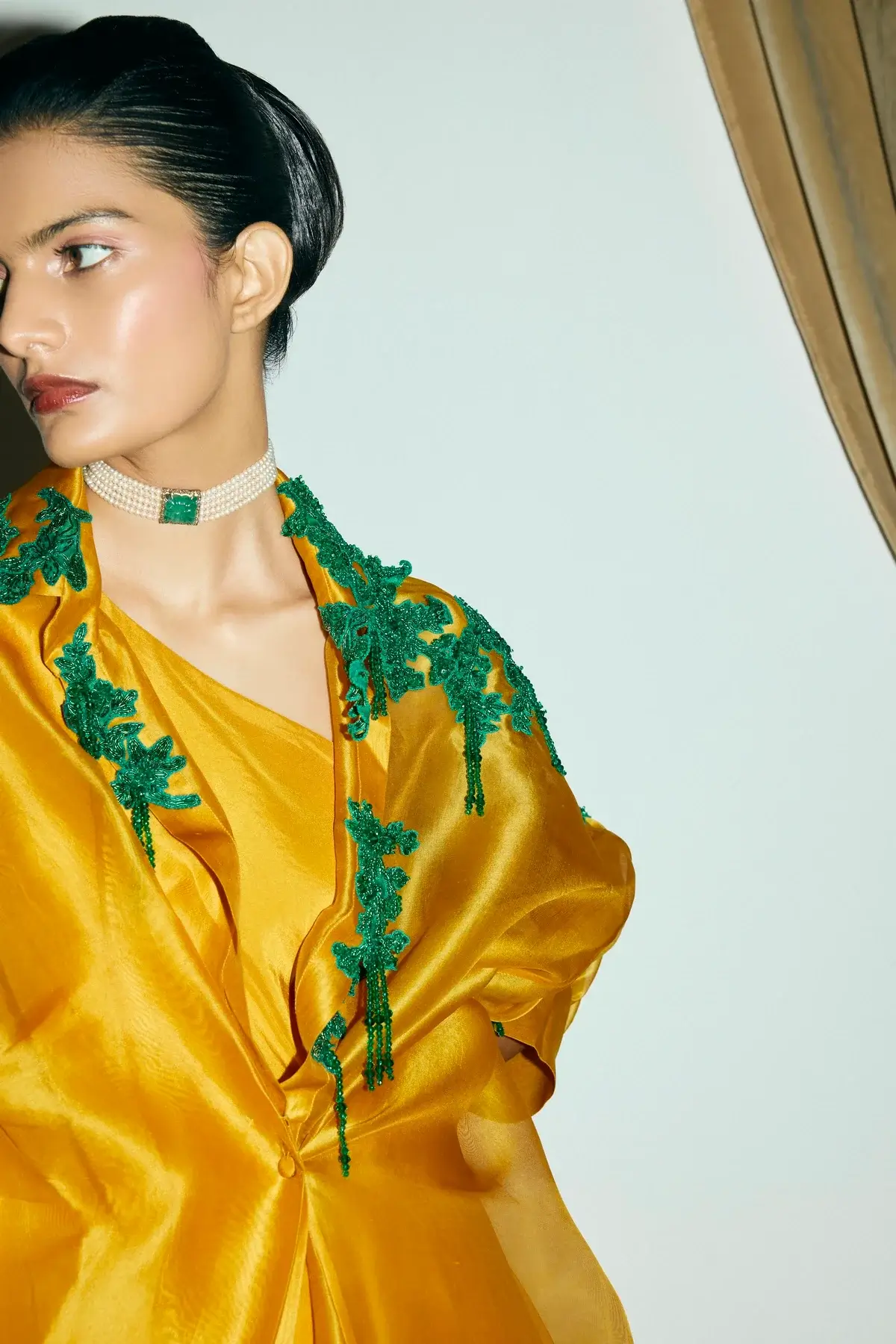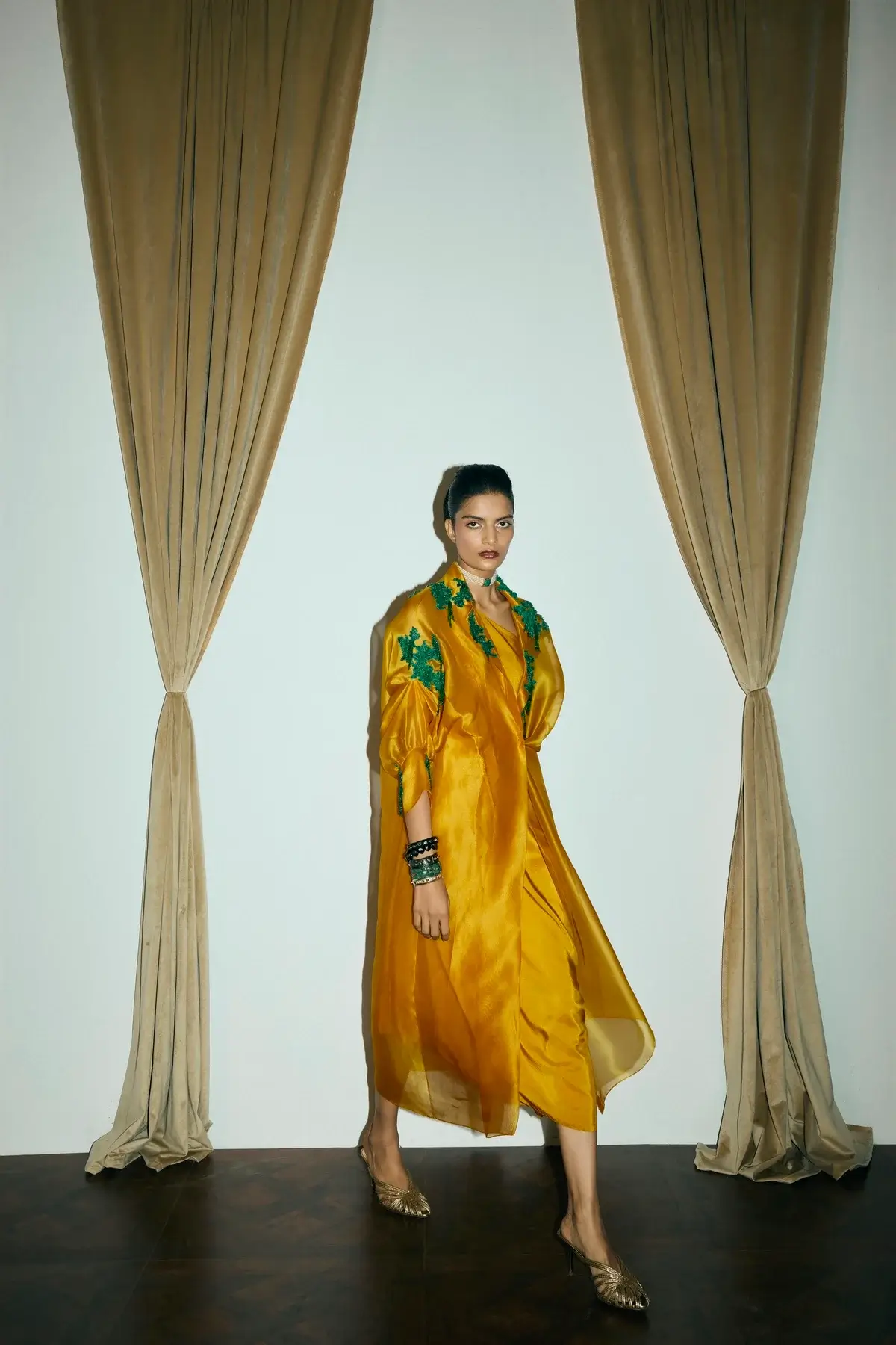 Ivory organza jacket with emerald green coral & moss inspired embellishments all over with front closure and signature sleeves. A silk drape dress to pair with it.