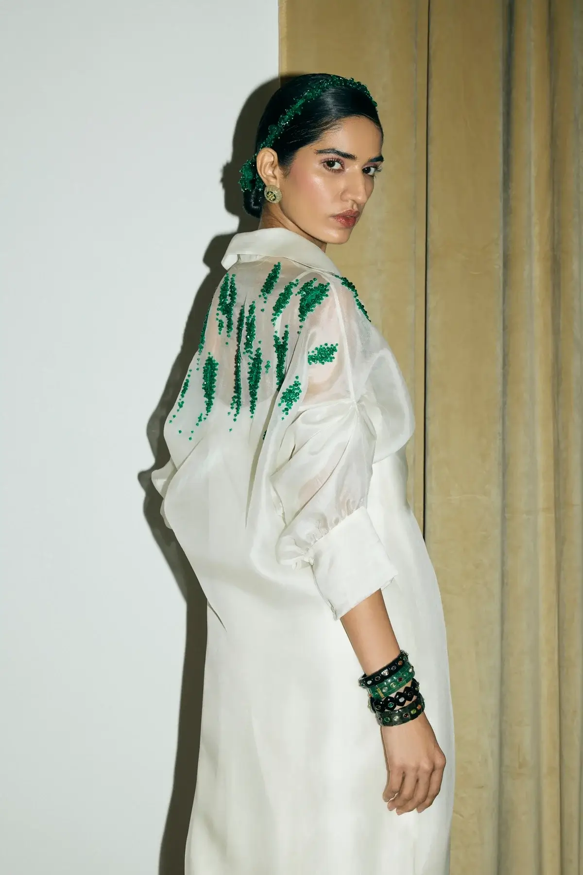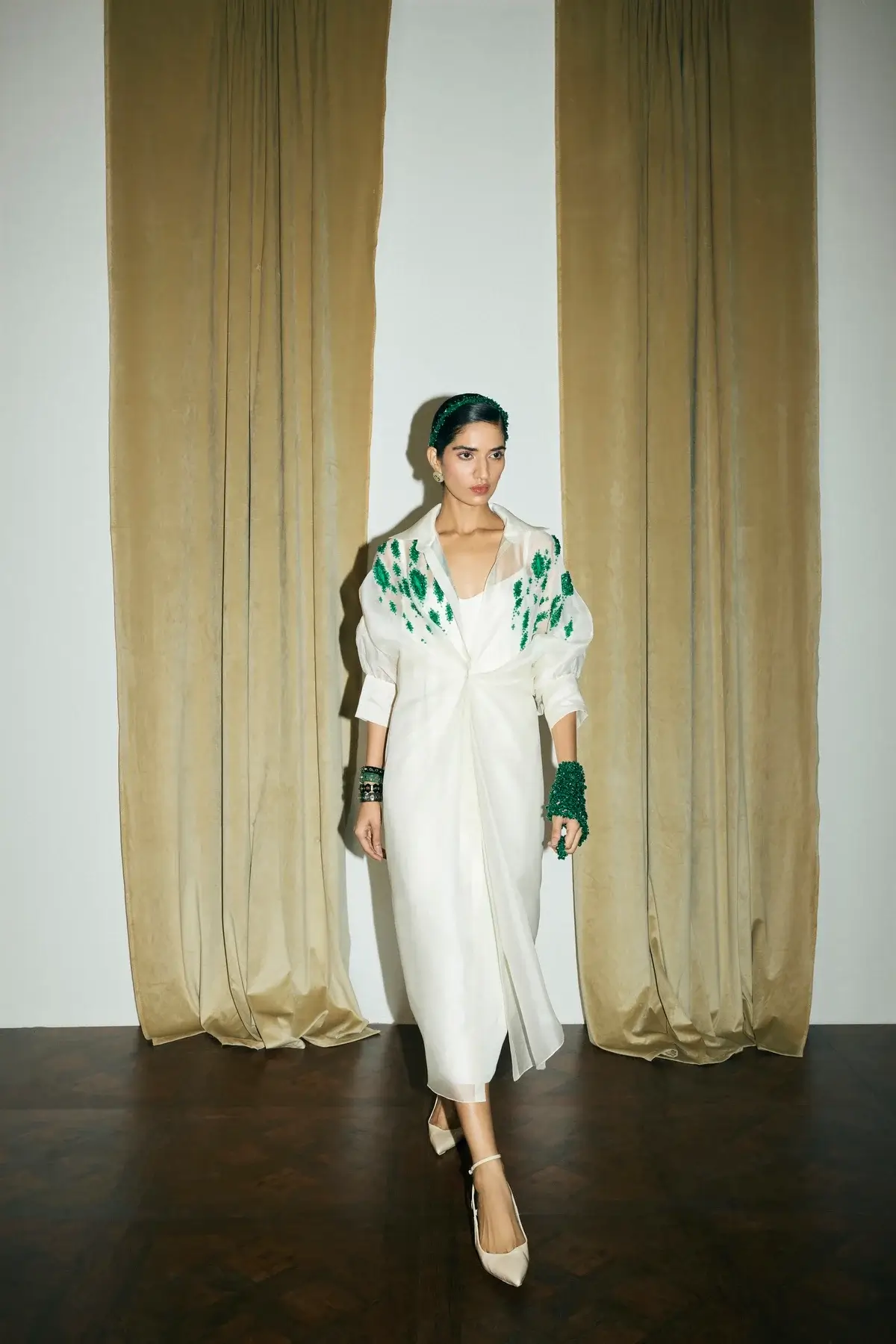 Ivory organza jacket with emerald green embellishments all over with front closure and signature sleeves. A silk slip dress to pair with it.