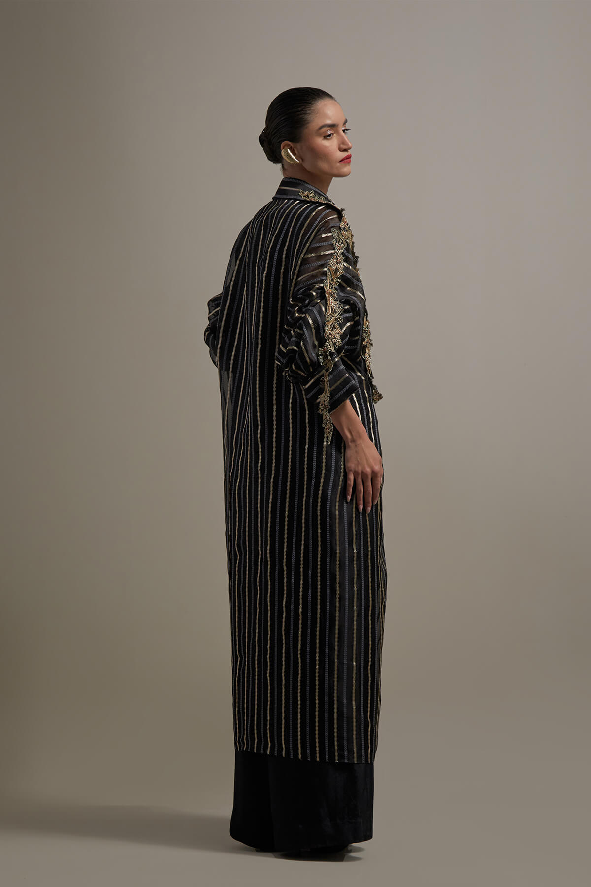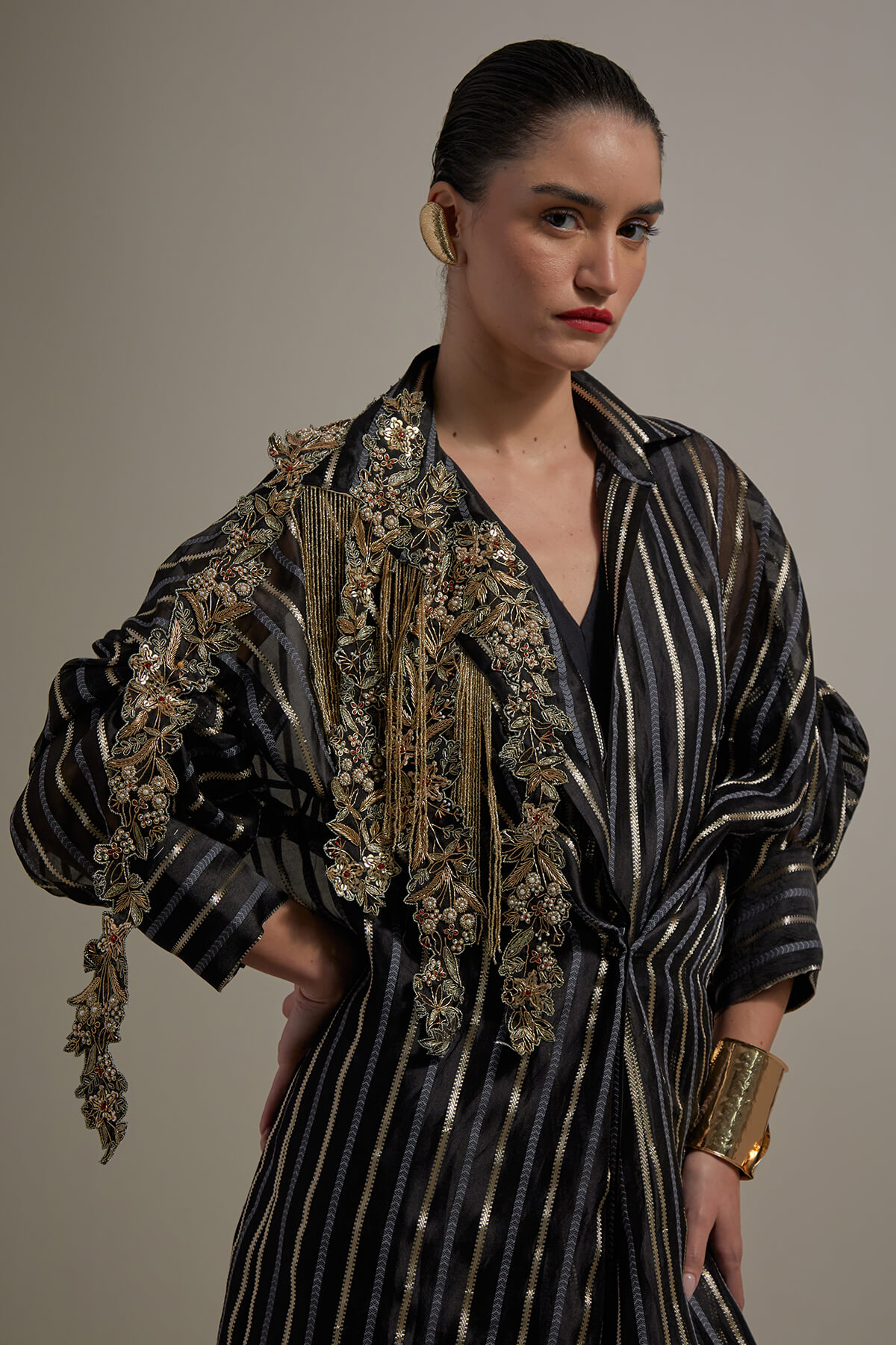 wide leg silk jumpsuit with a back closure embroidered organza jacket.