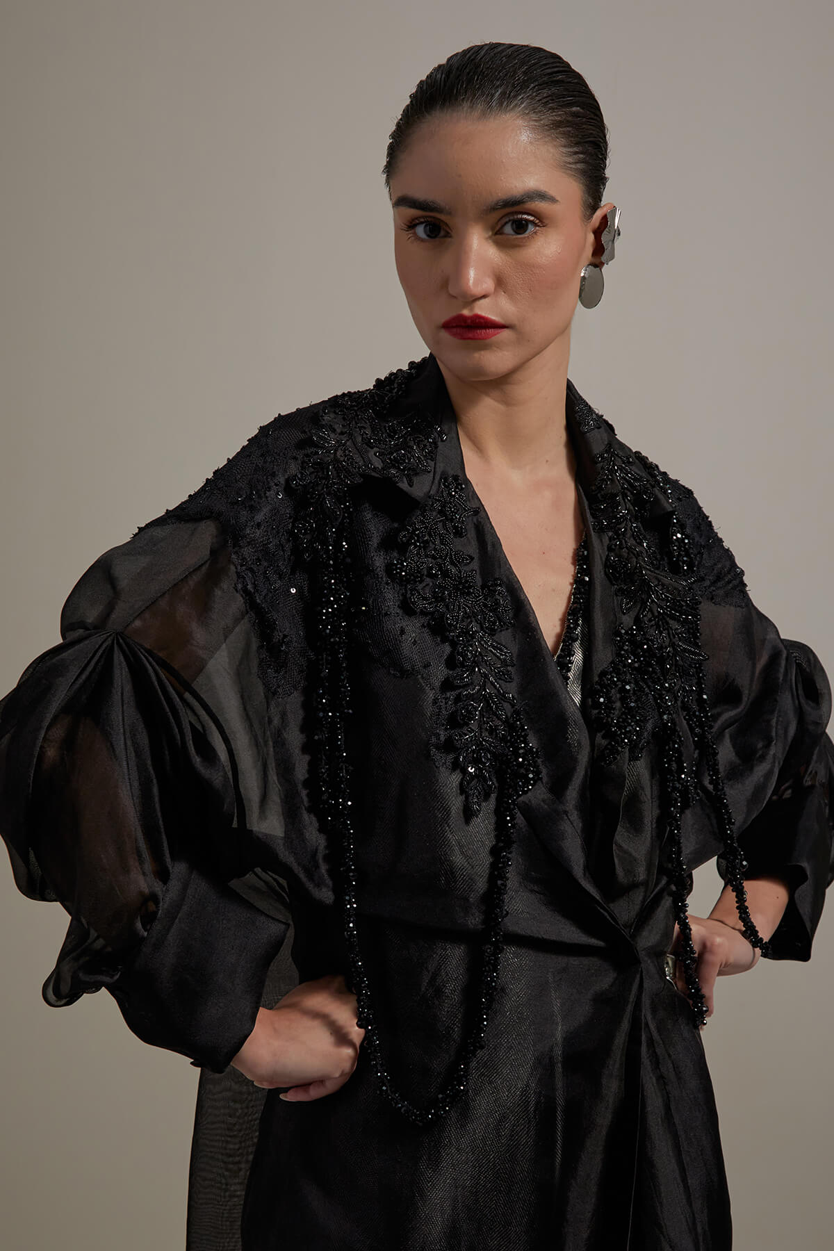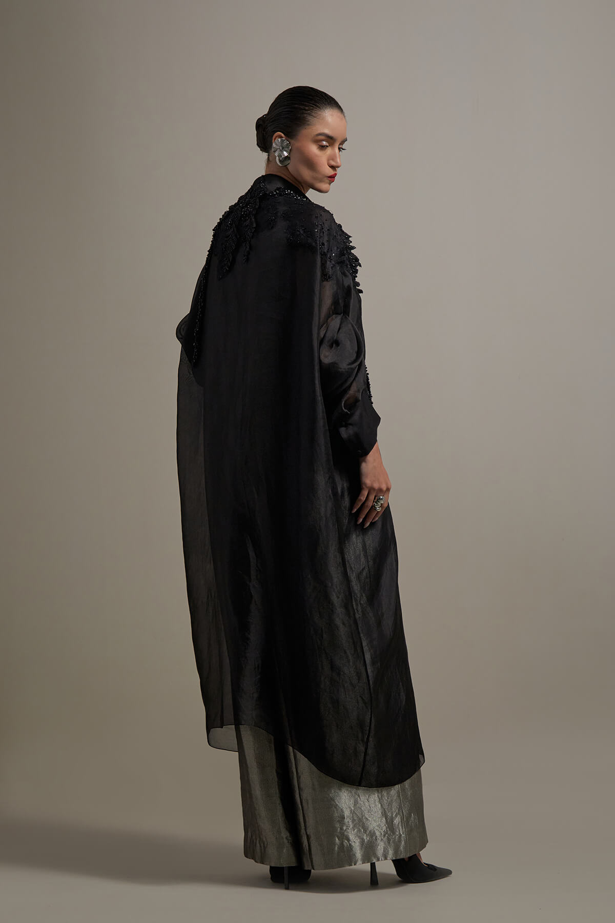 wide leg brocade embroidered jumpsuit with a back closure embroidered organza jacket.