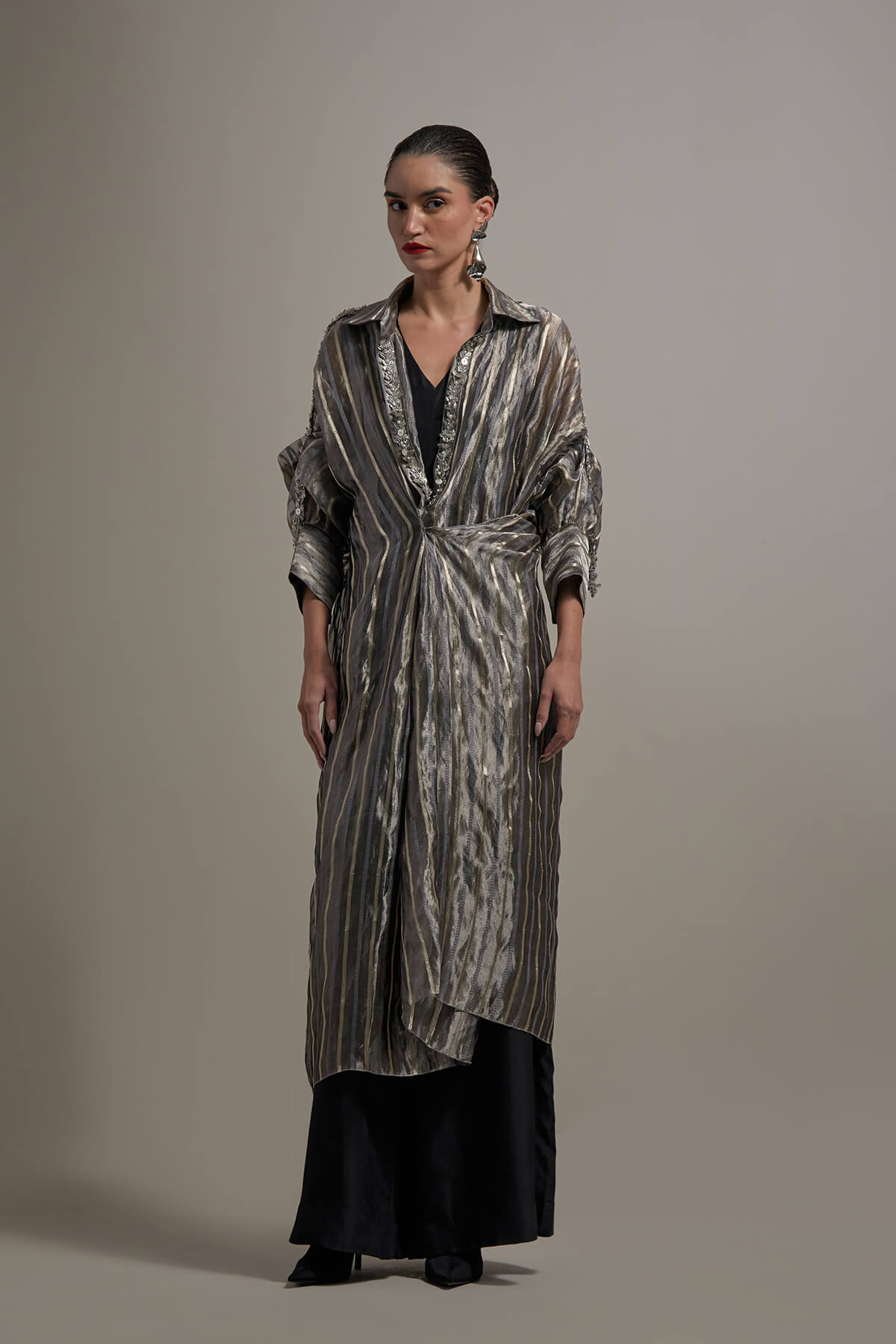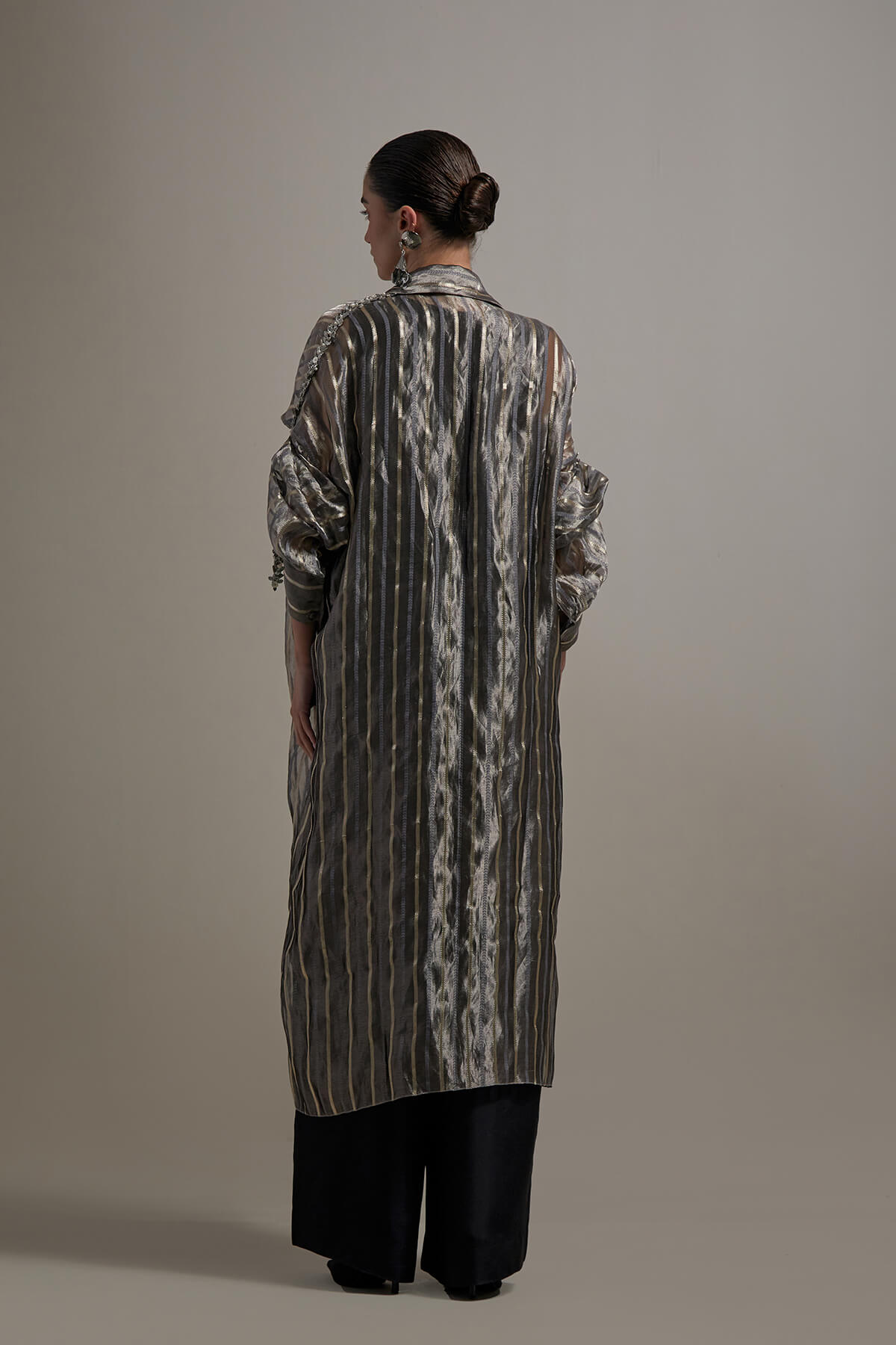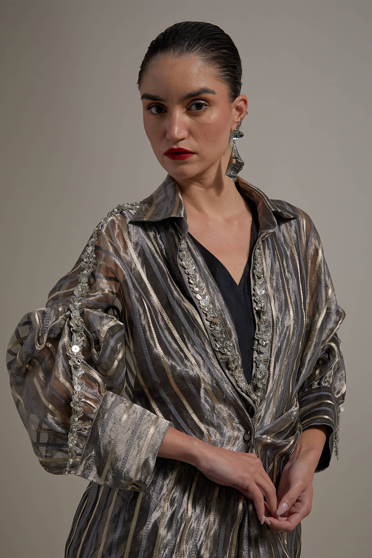 Wide leg Silk jumpsuit with a back closure embroided organza jacket.