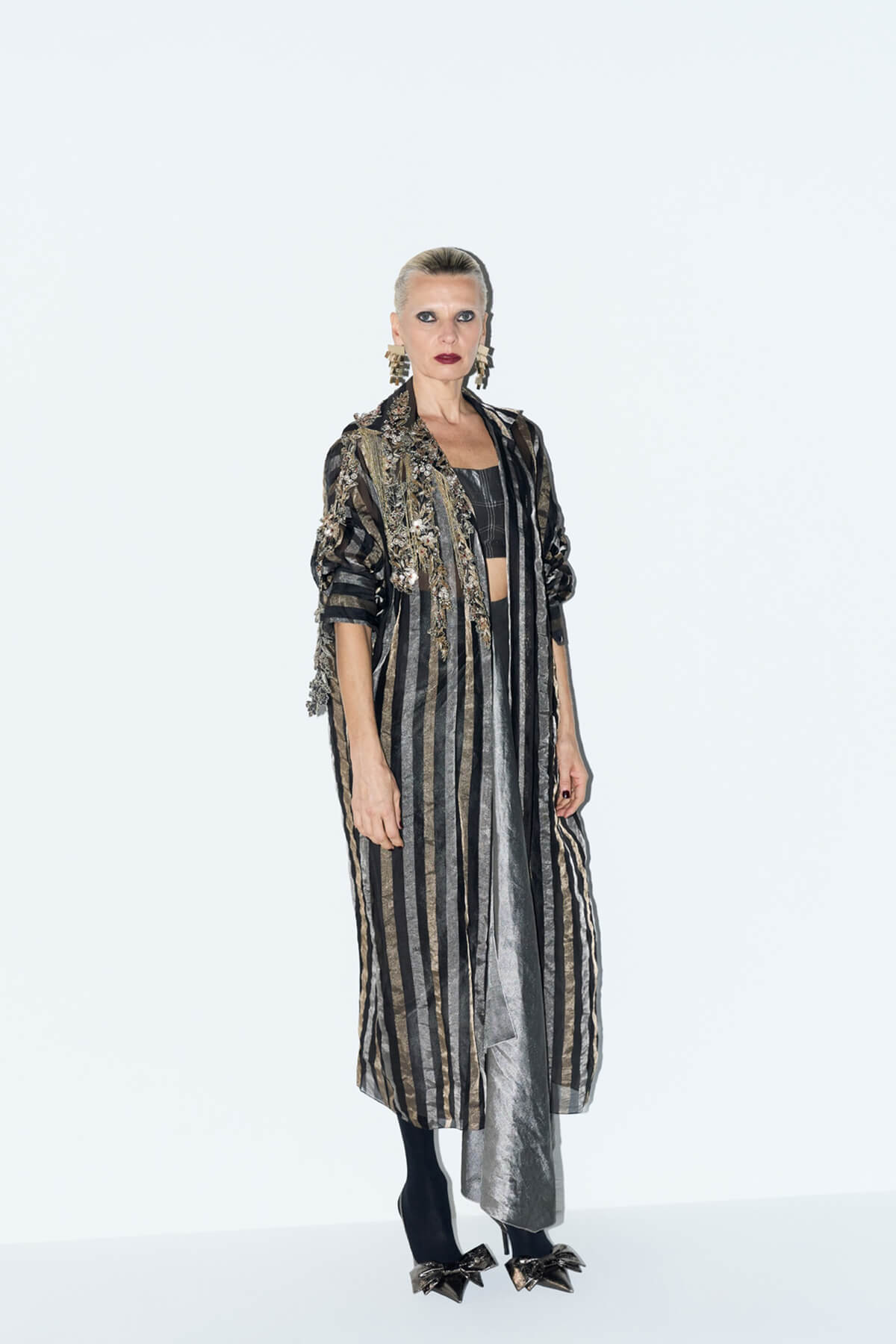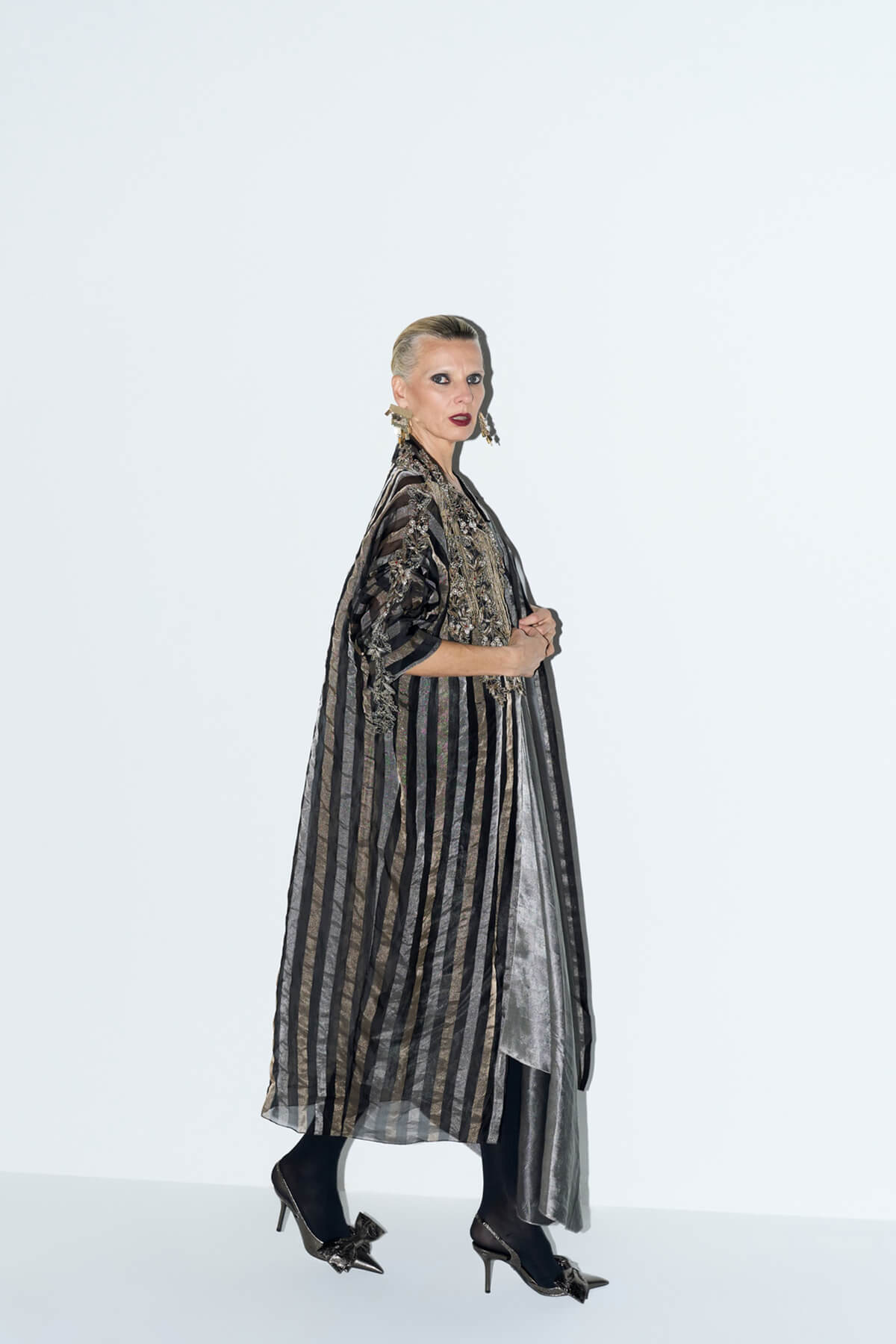 Tissue jacket with signature sleeves and front closure embellished with dabka, glass beads hangings.
