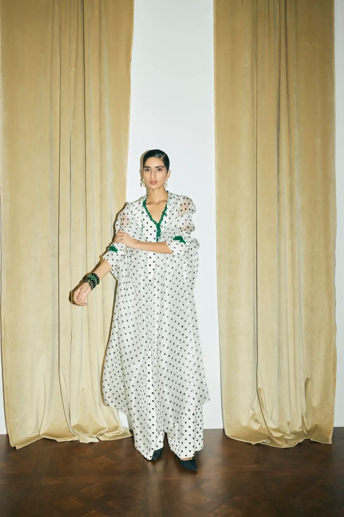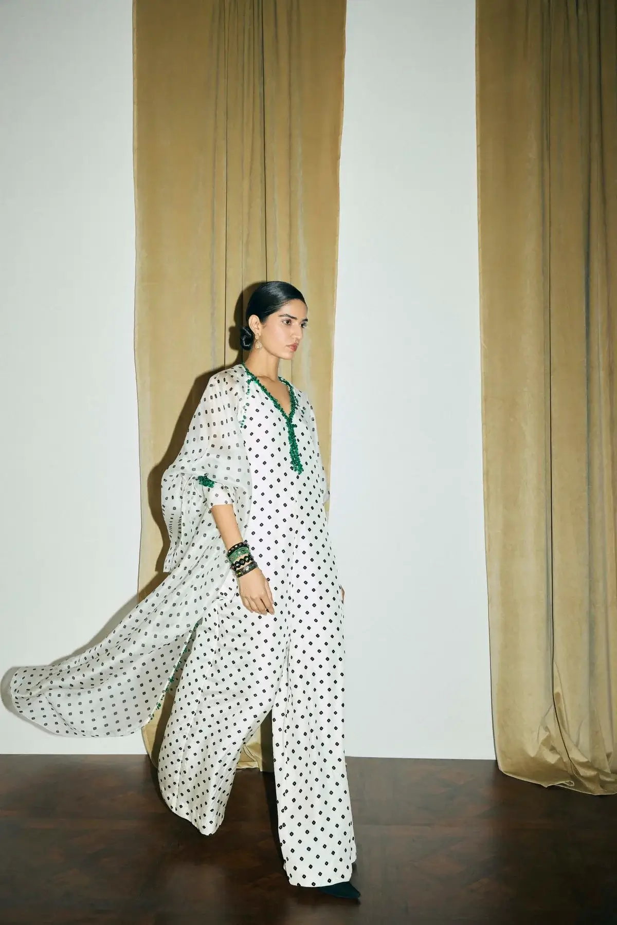 Hand printed Bandhani silk jumpsuit with green beads embelished on the neck. Organza overlay with signature sleeves and front closure embelished on the cuff.