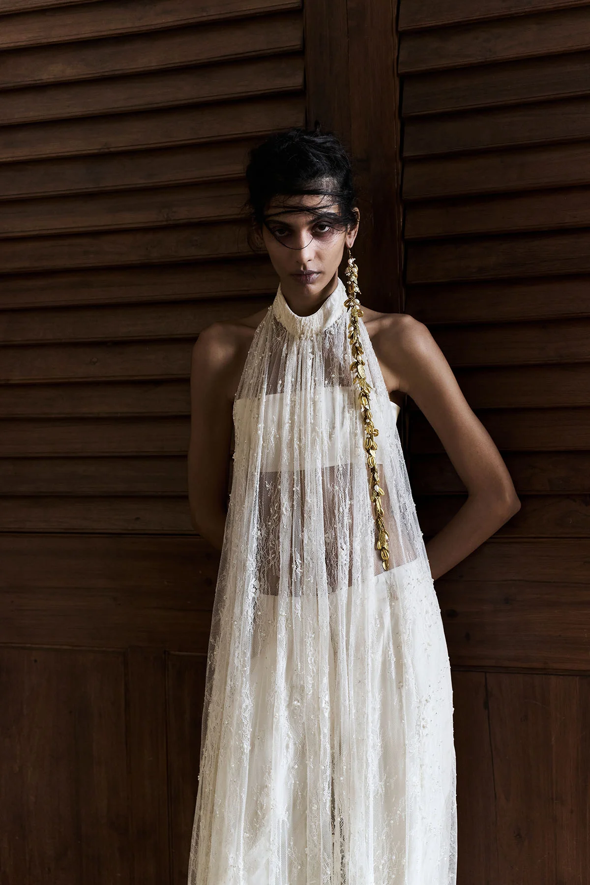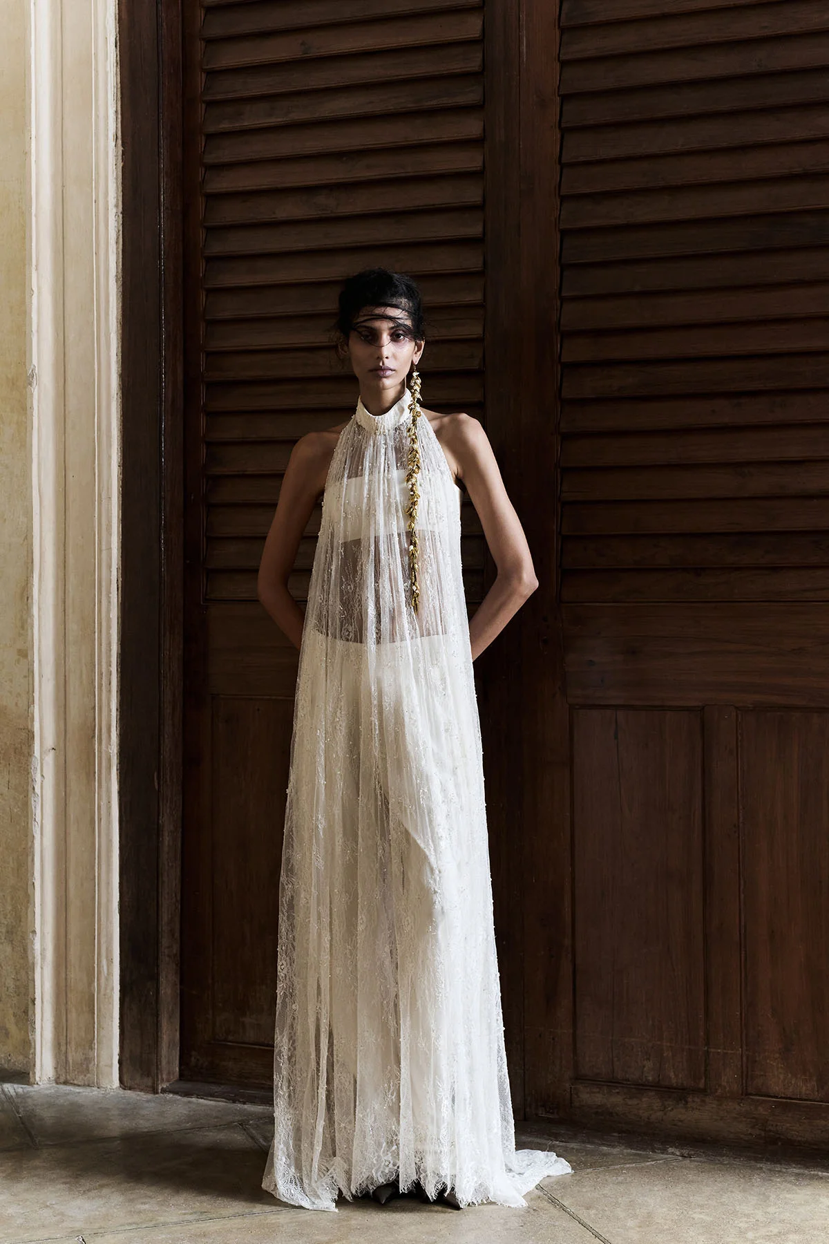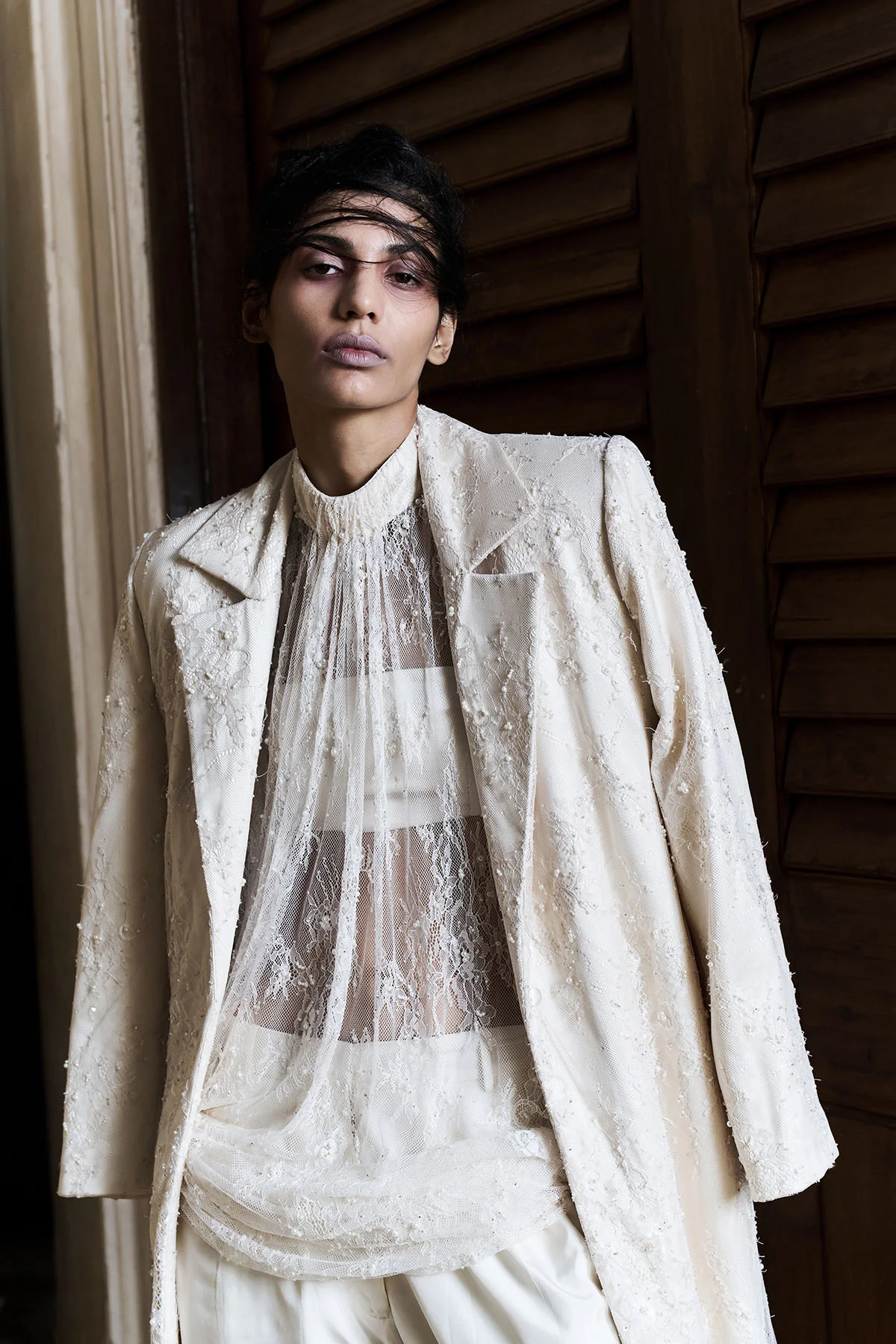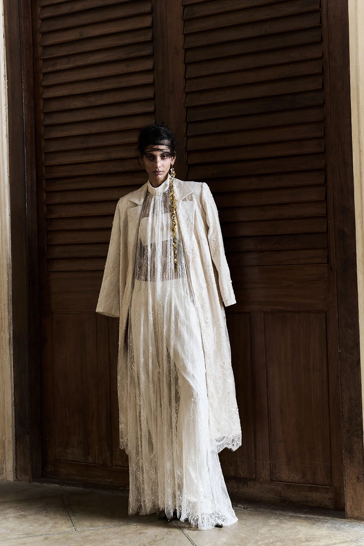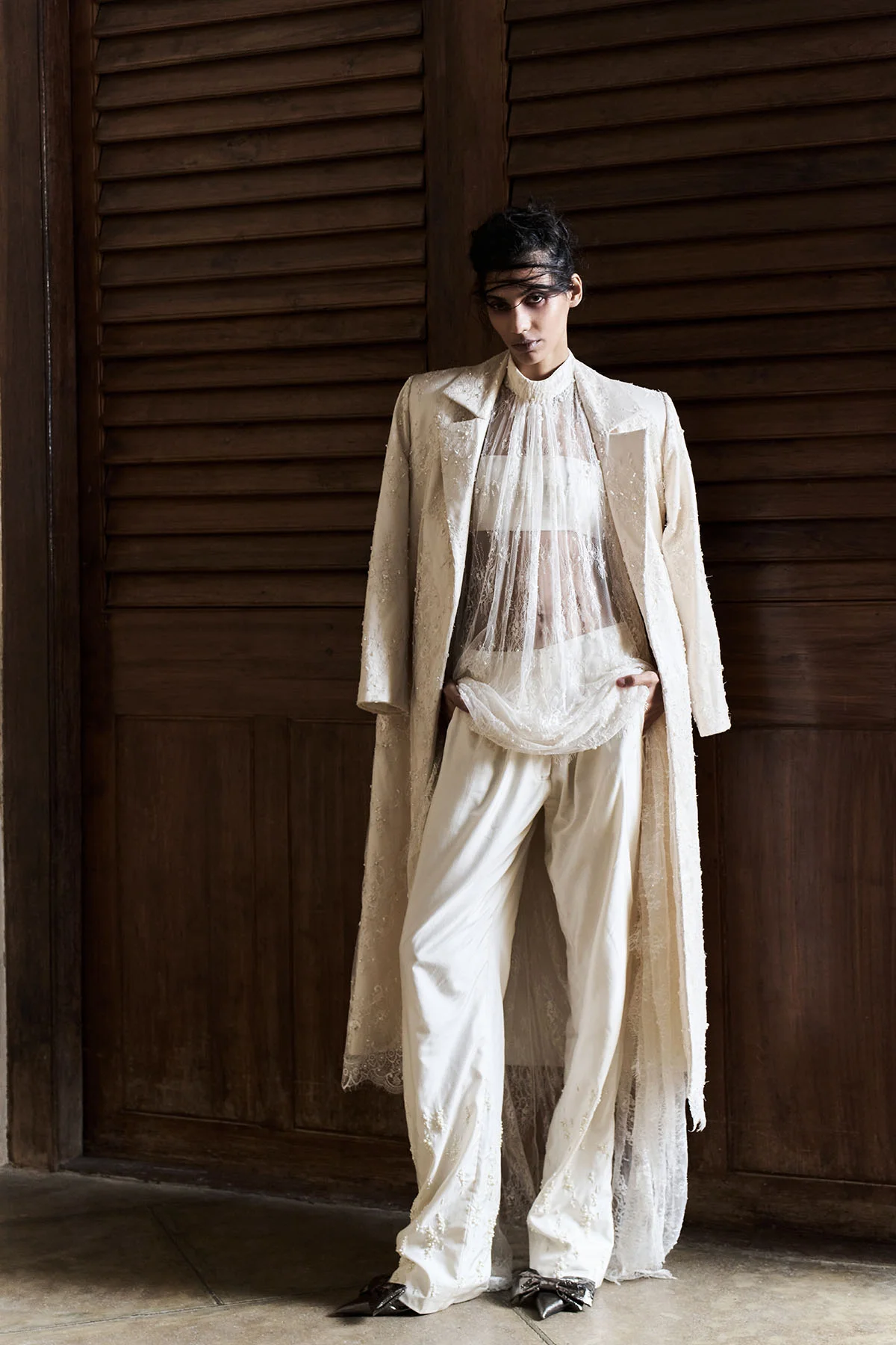 Embroidered Lace Dress with high neck and back closure. Structured jacket with embroidered Lace. Hand embroidered silk pants under it.