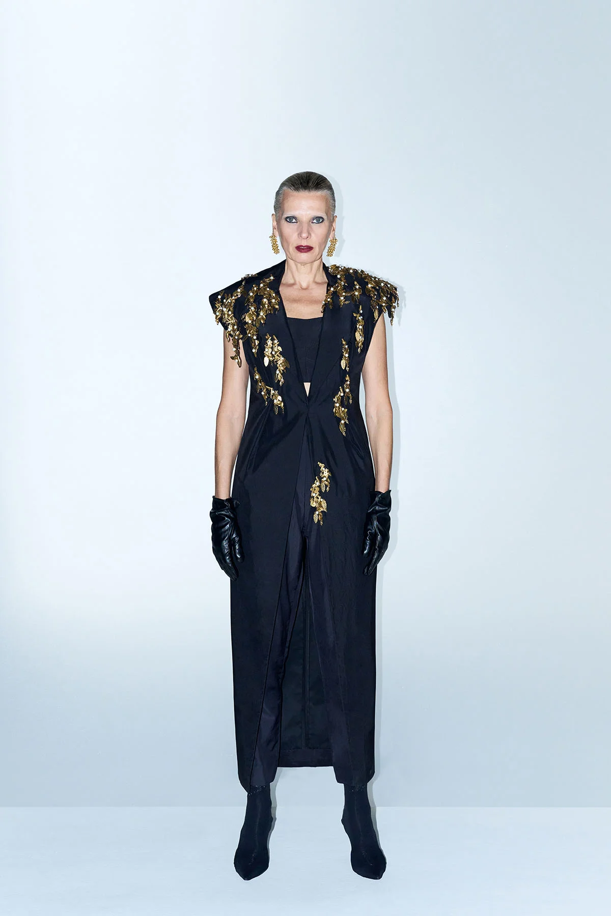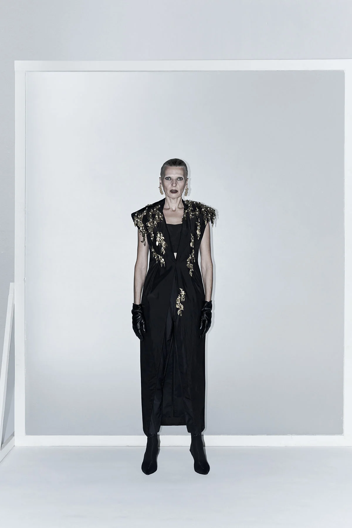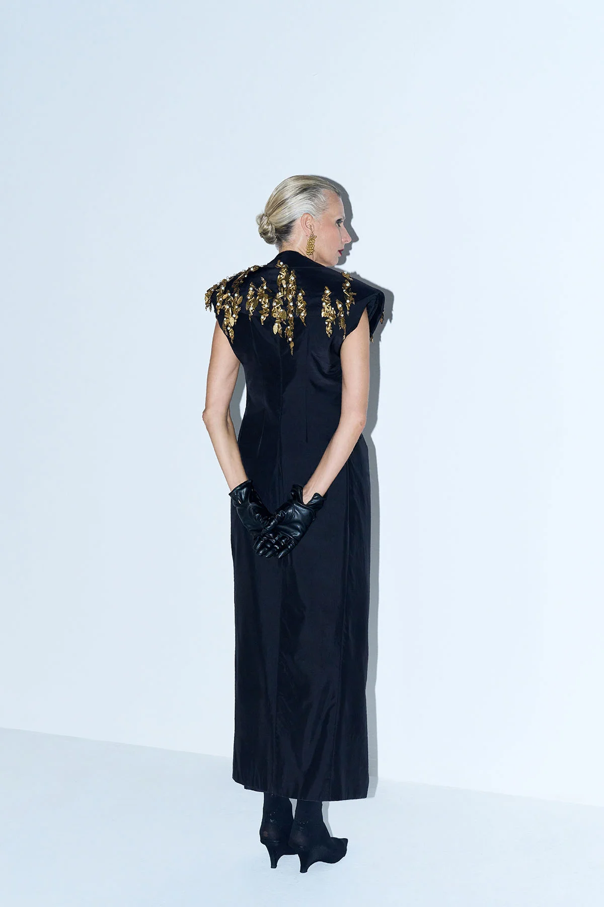 Silk structured jacket with collar and front closure embellished with gold metal leaf motifs.