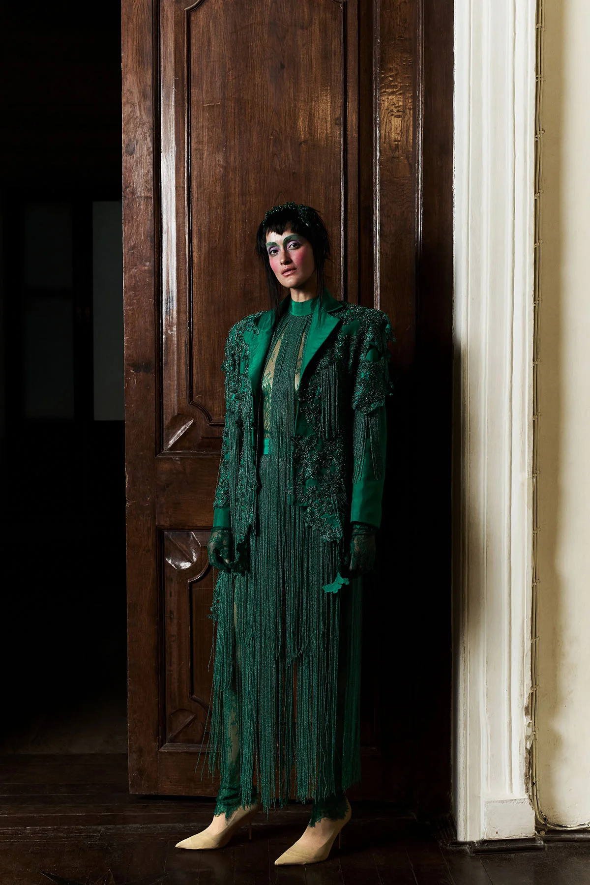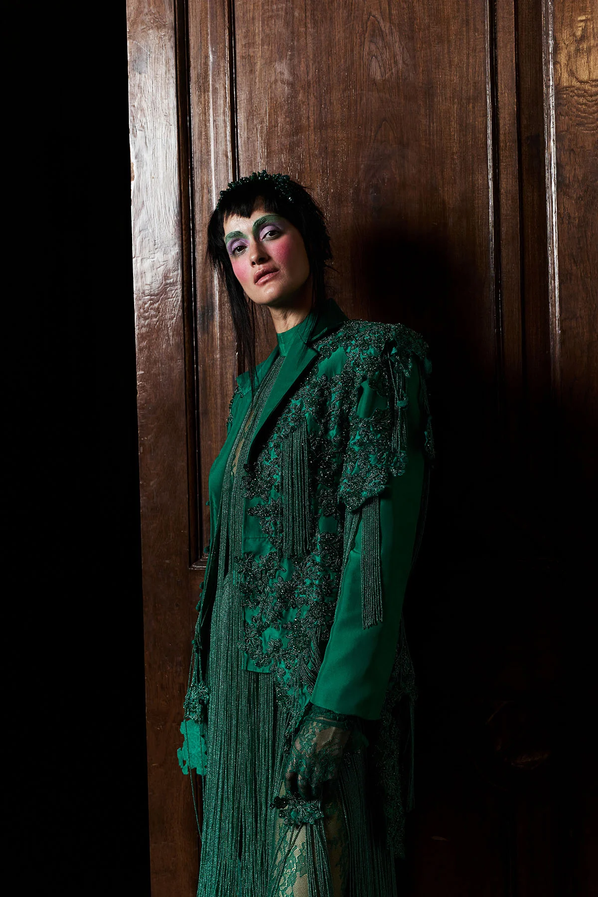 Silk blazer embellished with glass beads and floral appliques all over and hangings