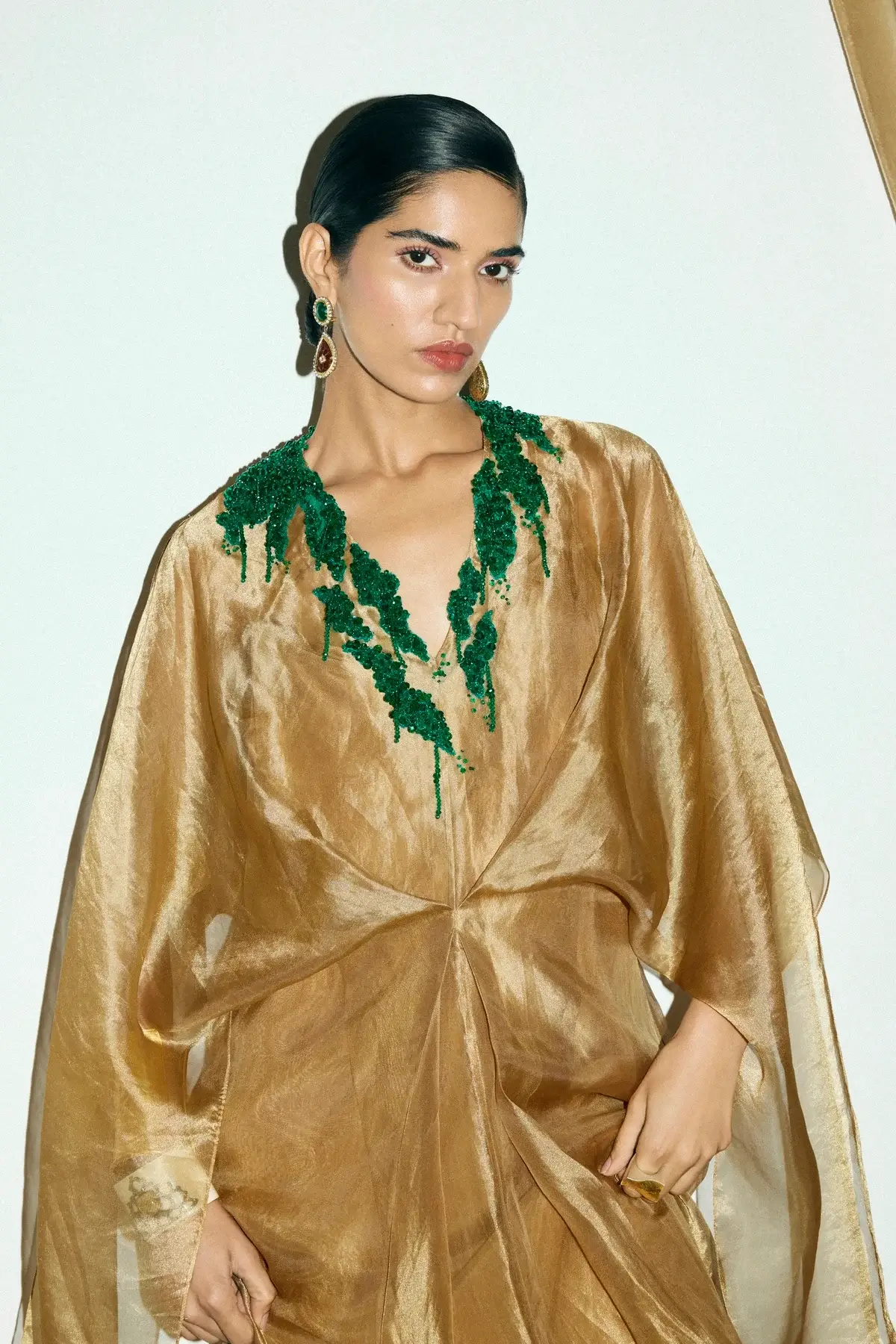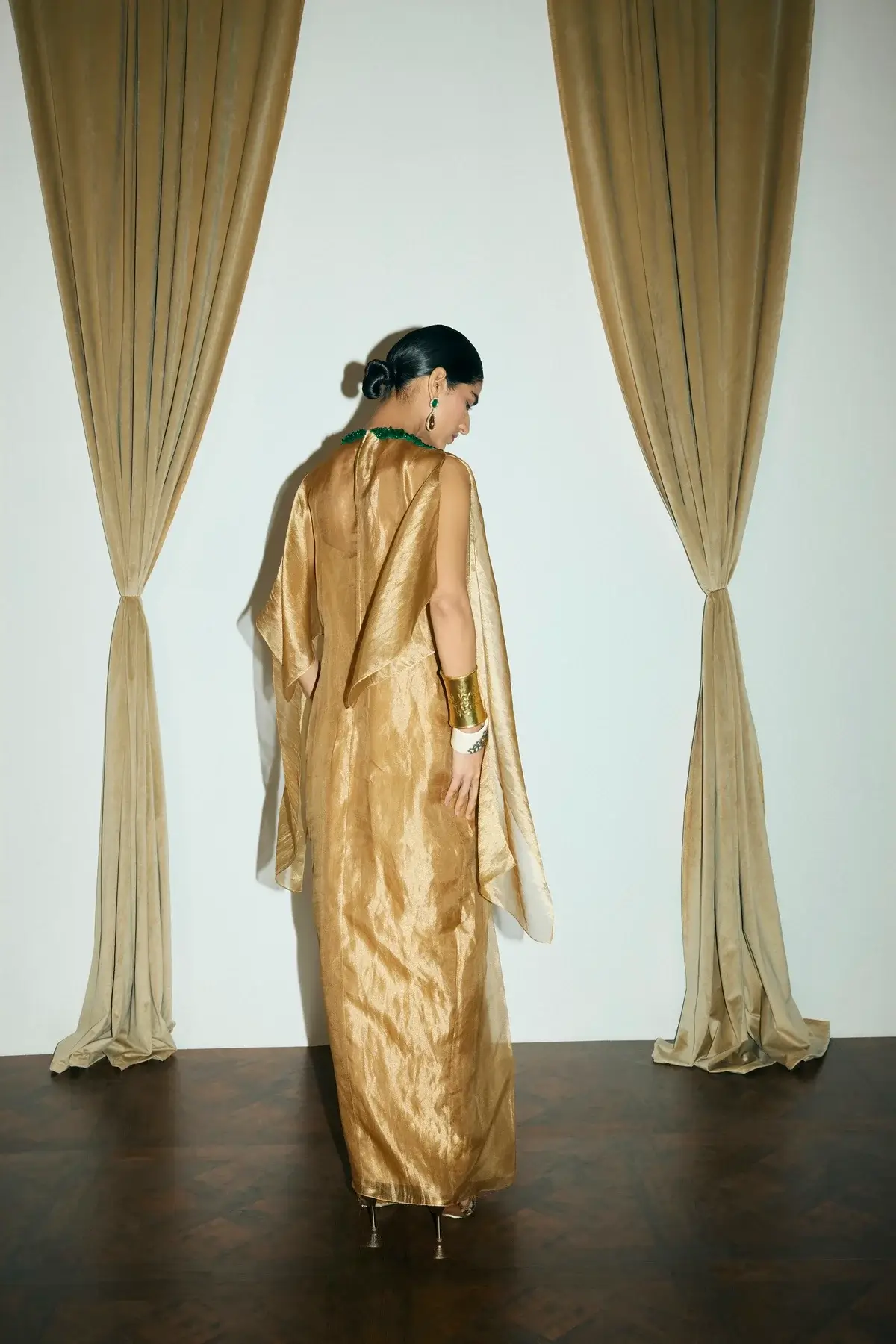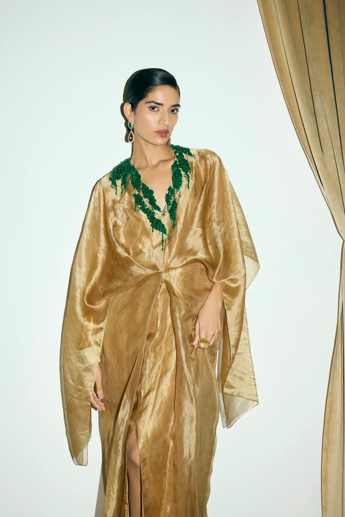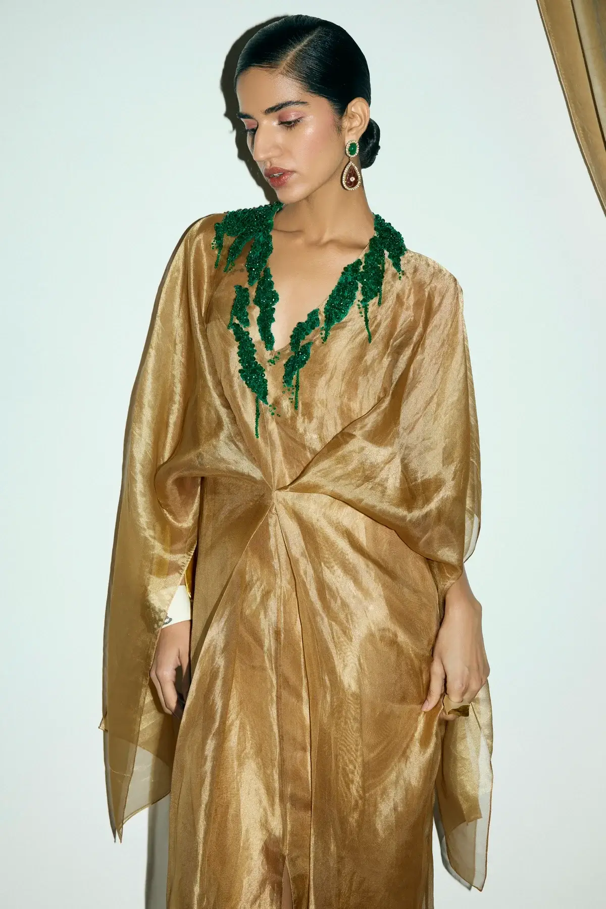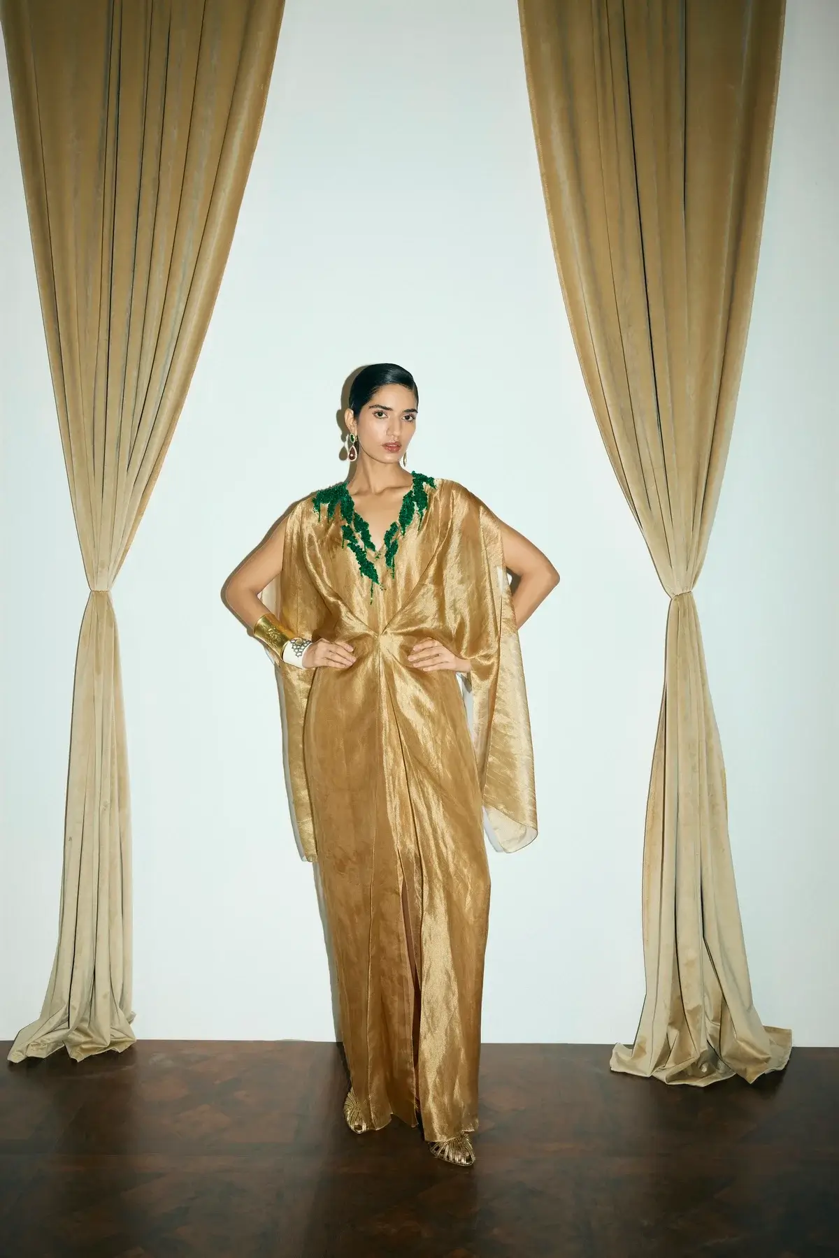 Draped dress in gold tissue with a cinched front with green applique detail on the neck. Silk slip included.