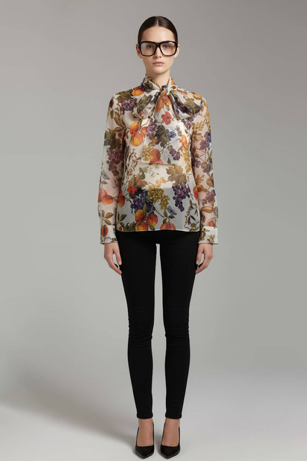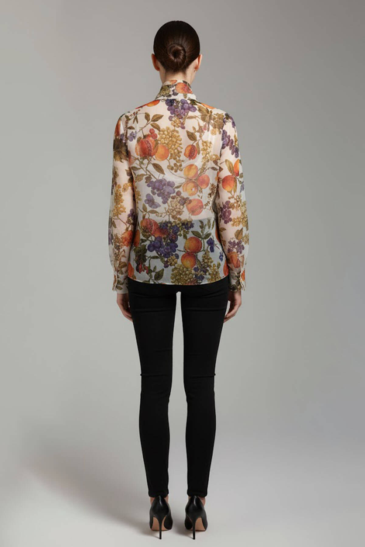 A printed organza shirt with a bow in the front. Most of these images are AI generated, so there can be a slight difference.