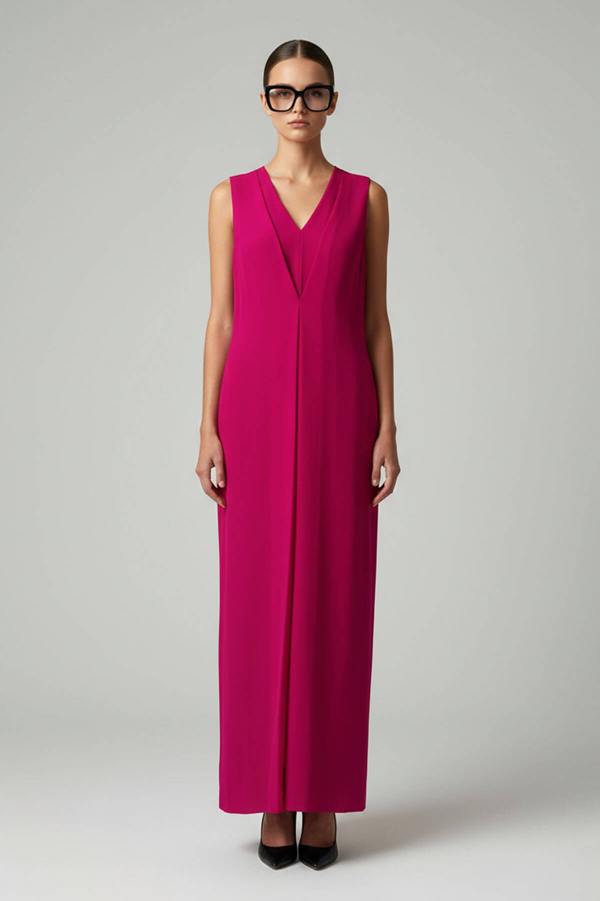 Sleeveless silk dress with front tucks. Most of these images are AI generated, so there can be a slight difference.