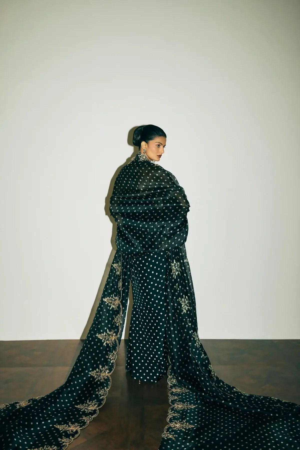Black Bandhani Print and Scallop Embroidery |