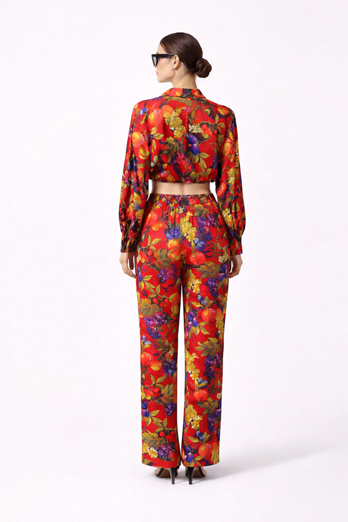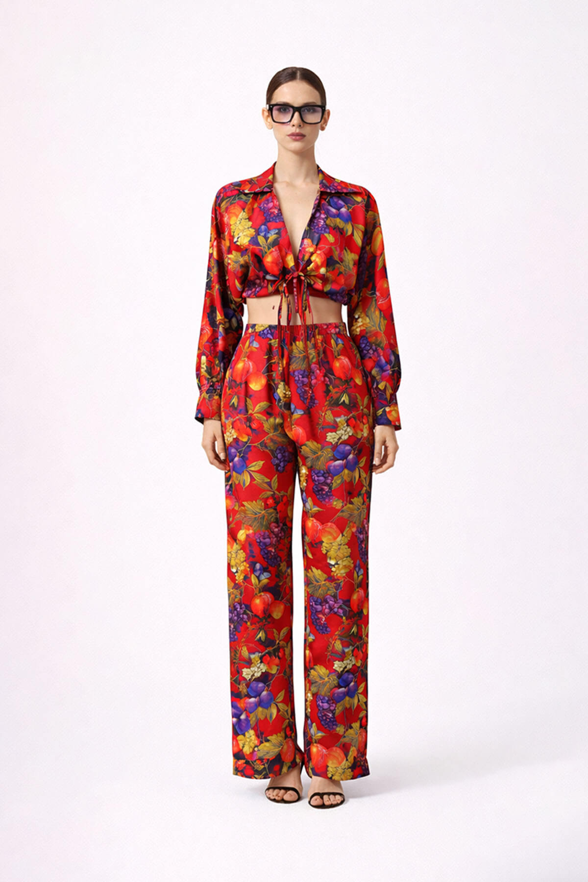 A short printed silk crop top teamed with high waist pants. Most of these images are AI generated, so there can be a slight difference.